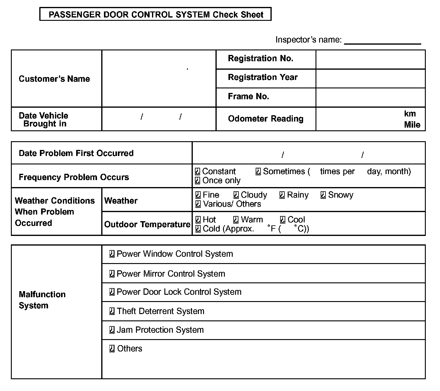 Passenger Door Control System Check Sheet: