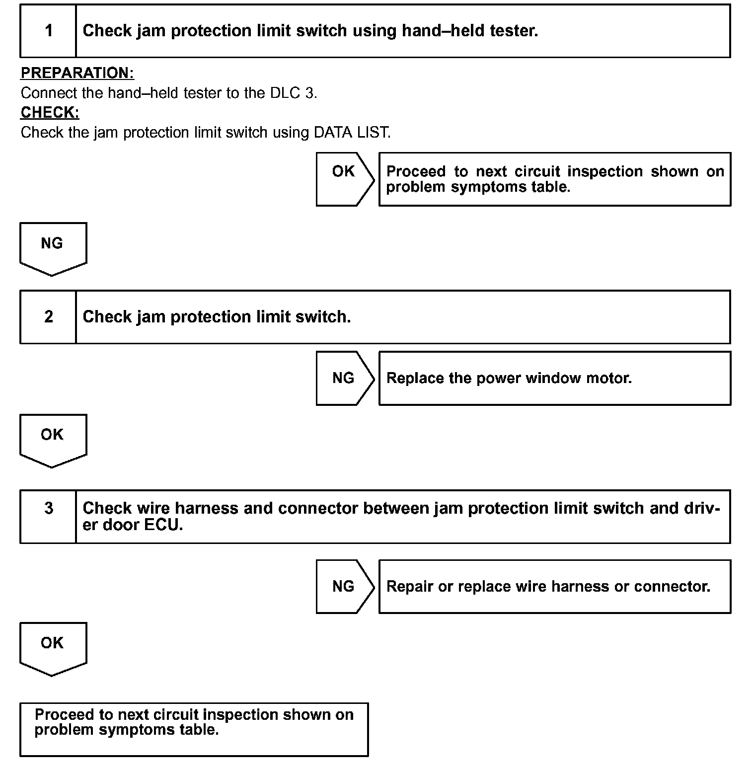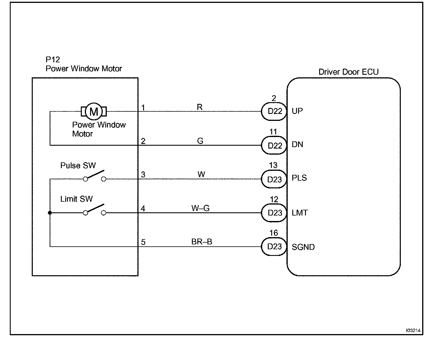 Jam protection limit switch is built-in the power window motor. This switch functions to turn "OFF" before the top dead center, and ECU reads this "OFF" signal resulting in closing the window fully.