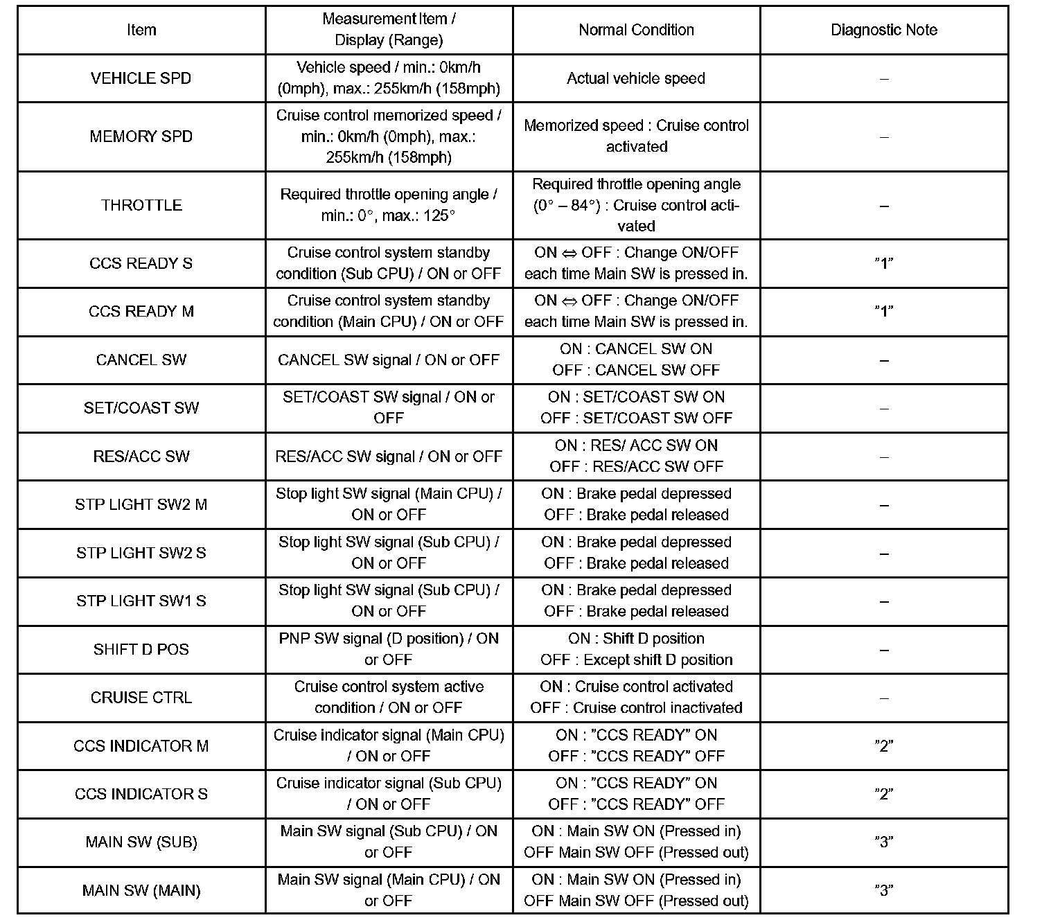 "3" is OK but cruise indicator not turn ON -> Indicator or wire harness or ECM failure