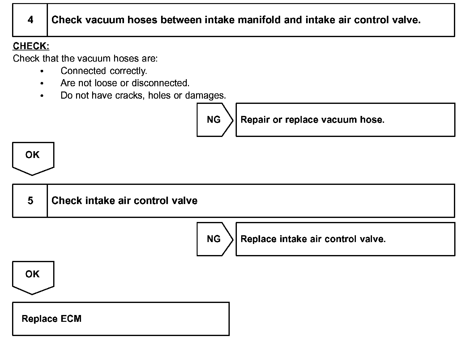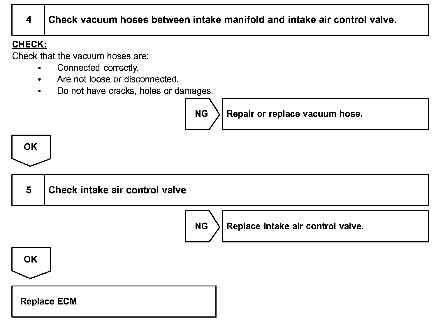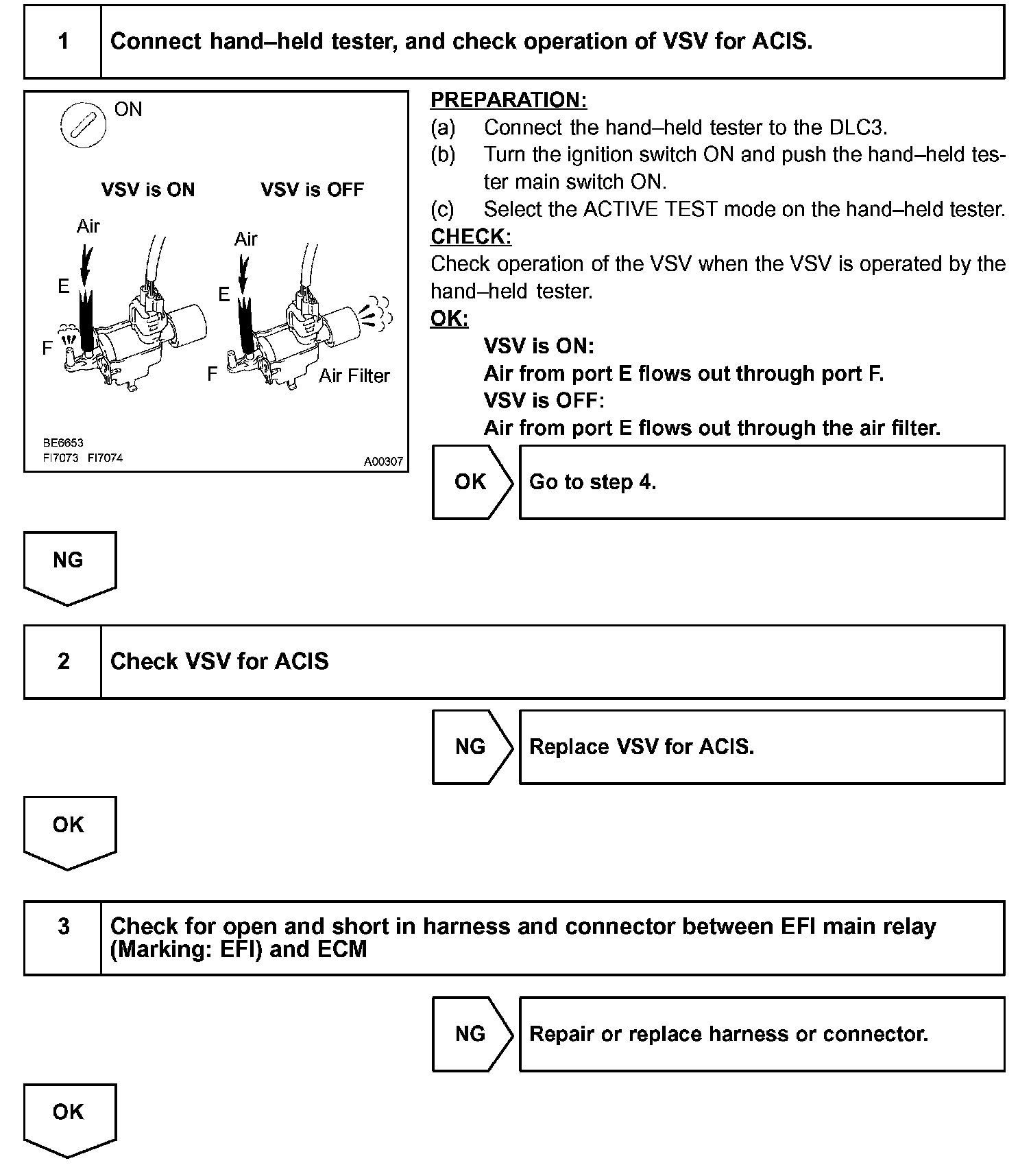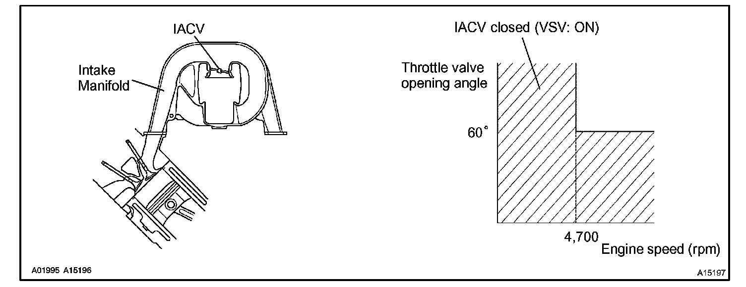 When the engine speed is 2,500 rpm or less or 4,900 rpm or more and the throttle valve opening angle is 60° or more, the VSV is OFF, so that the IACV is open. All the other times, the ECM turns the VSV ON and closes the IACV.