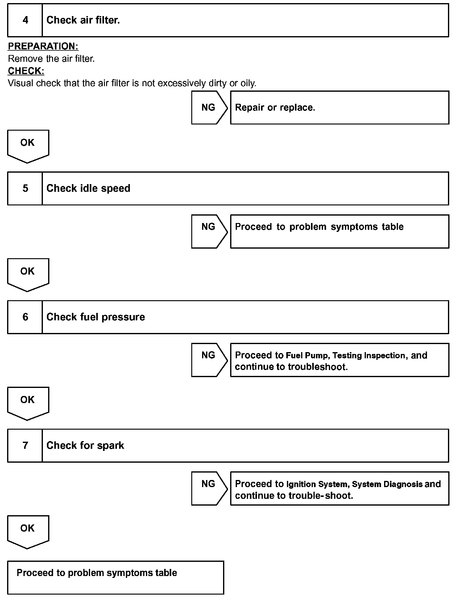 When the malfunction is not confirmed in the DTC check, troubleshooting should be carried out in all the possible circuits considered as causes of the problem. In many cases, by carrying out the basic engine check shown in the flowchart, the location causing the problem can be found quickly and efficiently. Therefore, using this check is essential in the engine troubleshooting.