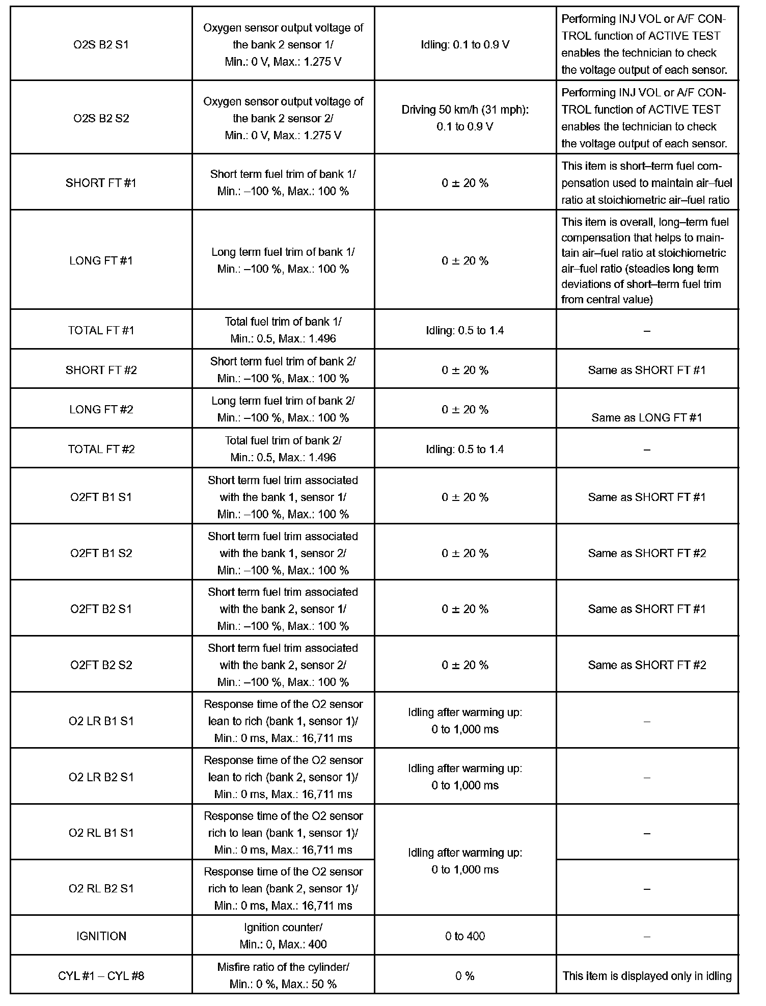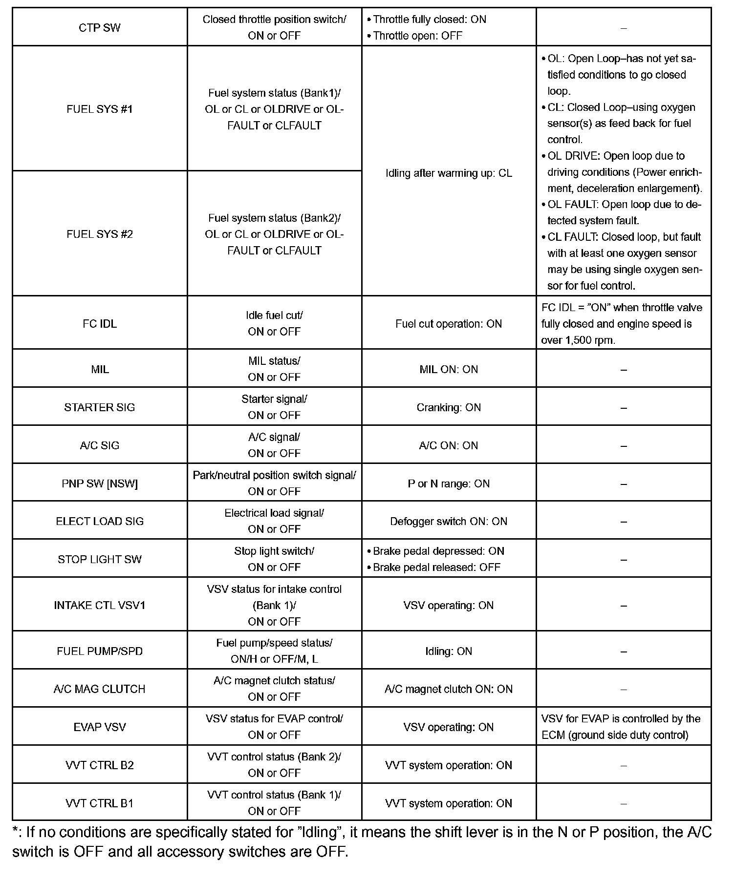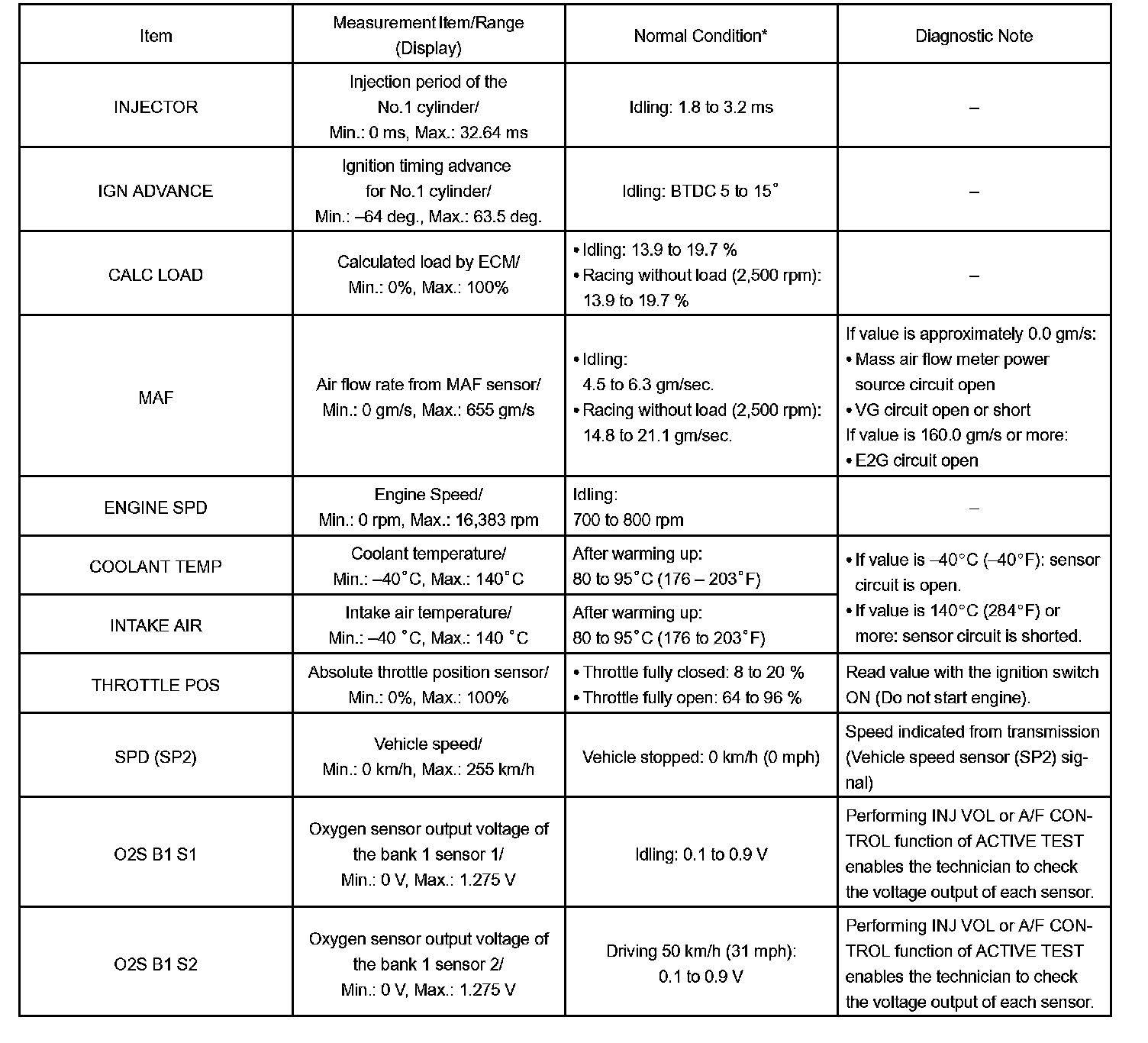 HINT: Using the hand-held tester DATA LIST allows switch, sensor, actuator and other item values to be read without removing any parts. Reading the DATA LIST early in troubleshooting is one way to shorten labor time.