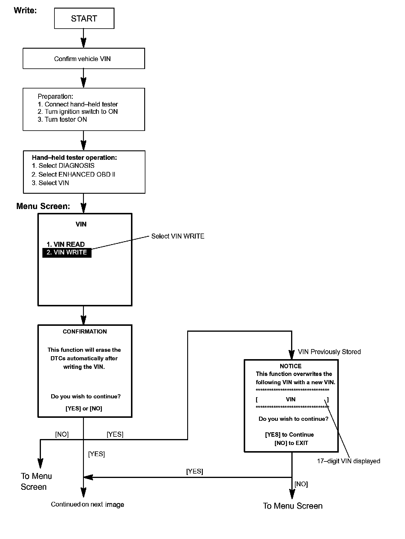c. Write VIN: Explains the VIN writing process in a flowchart. This process allows the VIN to be input into the ECM. If the ECM is changed, or the VIN and VIN do not match, the VIN can be registered, or overwritten in the ECM by following this procedure.