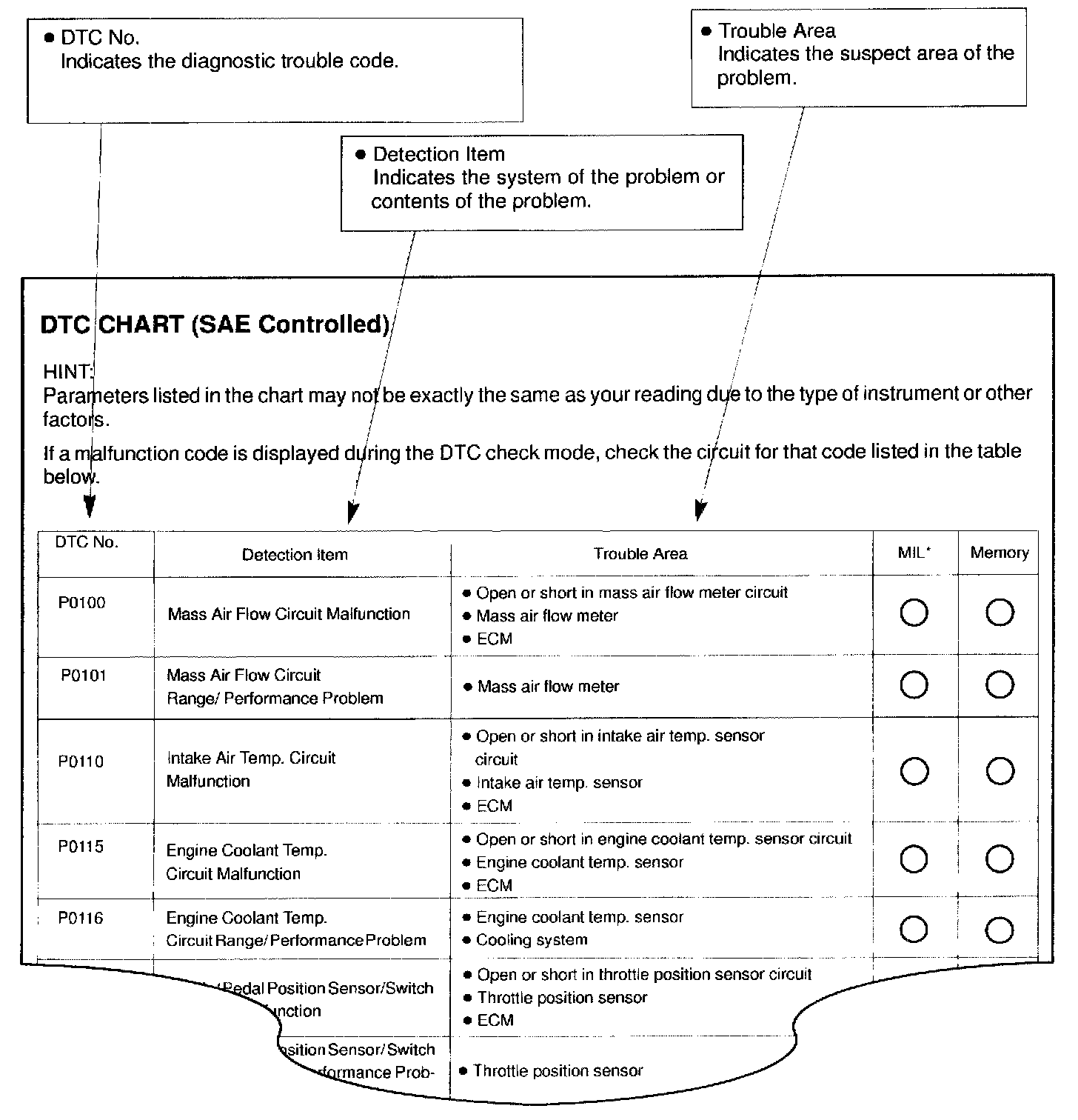 The inspection procedure is shown in the table. This table permits efficient and accurate troubleshooting using the diagnostic trouble codes displayed in the diagnostic trouble code check. Proceed with troubleshooting in accordance with the inspection procedure given in the diagnostic chart corresponding to the diagnostic trouble codes displayed. The engine diagnostic trouble code chart is shown as an example.