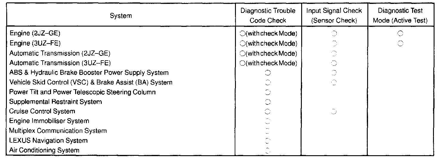 SYMPTOM CONFIRMATION AND DIAGNOSTIC TROUBLE CODE CHECKThe diagnostic system in the LEXUS GS430/GS300 fulfills various functions. The first function is the Diagnostic Trouble Code Check in which a malfunction in the signal circuits to the ECU is stored in code in the ECU memory at the time of occurrence, to be output by the technician during troubleshooting. Another function is the Input Signal Check which checks if the signals from various switches are sent to the ECU correctly. By using these check functions, the problem areas can be narrowed down quickly and troubleshooting can be performed effectively. Diagnostic functions are incorporated in the following systems in the LEXUS GS430/GS300.