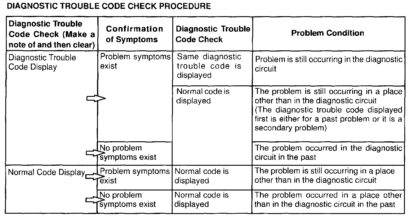 In diagnostic trouble code check, it is very important to determine whether the problem indicated by the diagnostic trouble code is still occurring or occurred in the past but returned to normal at present. In addition, it must be checked in the problem symptom check whether the malfunction indicated by the diagnostic trouble code is directly related to the problem symptom or not. For this reason, the diagnostic trouble codes should be checked before and after the symptom confirmation to determine the current conditions, as shown in the table. If this is not done, it may, depending on the case, result in unnecessary troubleshooting for normally operating systems, thus making it more difficult to locate the problem, or in repairs not pertinent to the problem. Therefore, always follow the procedure in correct order and perform the diagnostic trouble code check.