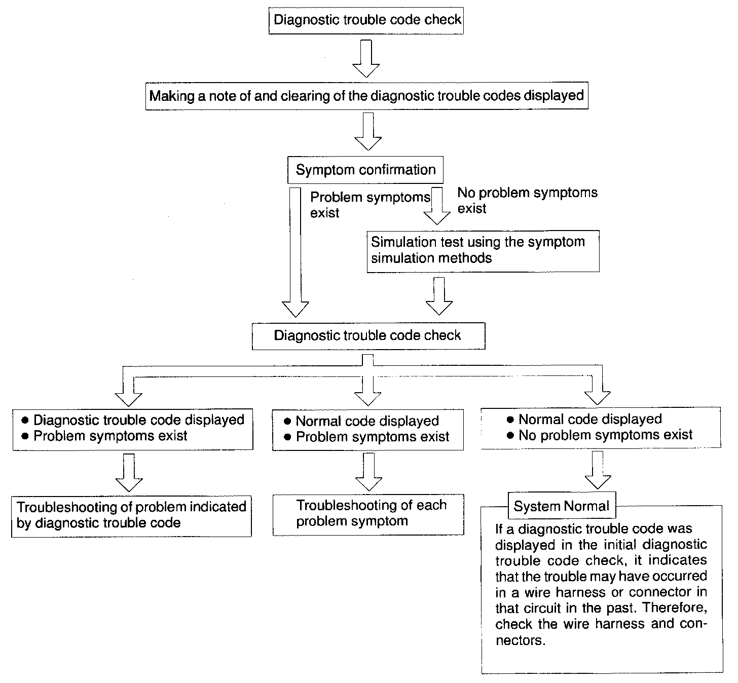 Taking into account the points given above, a flow chart showing how to proceed with troubleshooting using the diagnostic trouble code check is shown. This flow chart shows how to utilize the diagnostic trouble code check effectively, then by carefully checking the results, indicates how to proceed either to diagnostic trouble code troubleshooting or to troubleshooting of problem symptoms table.