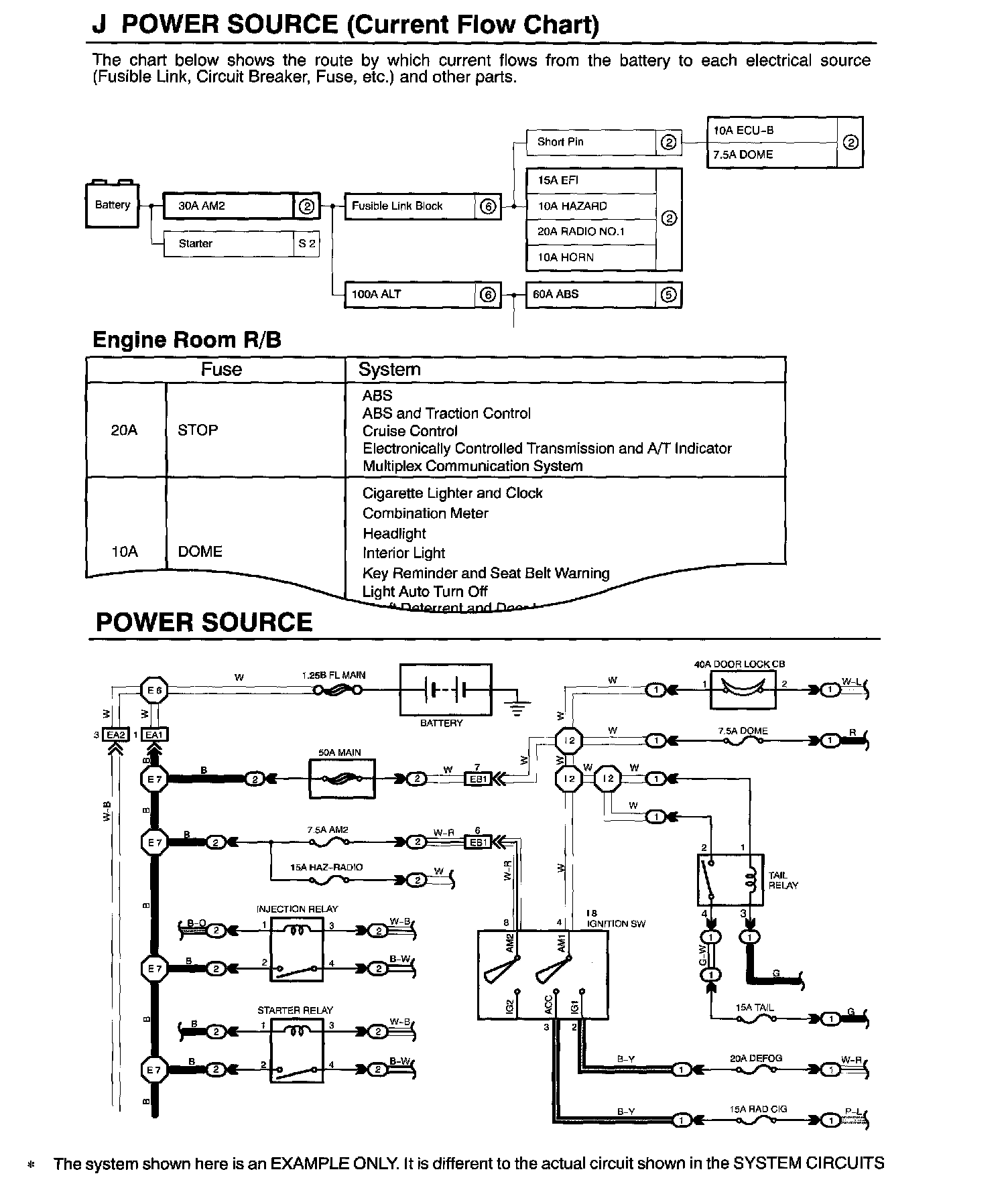 The "Current Flow Chart", describes which parts each power source (fuses, fusible links, and circuit breakers) transmits current to. In the Power Source circuit diagram, the conditions when battery power is supplied to each system are explained. Since all System Circuit diagrams start from the power source, the power source system must be fully understood.