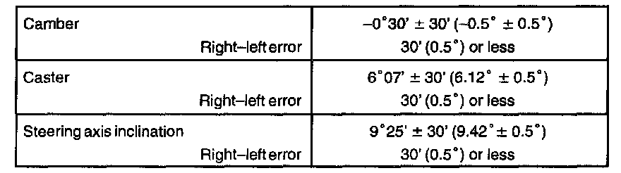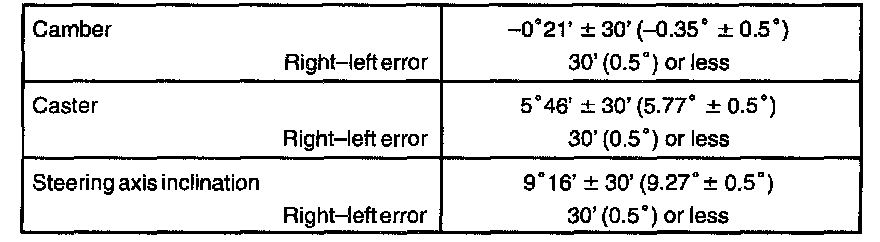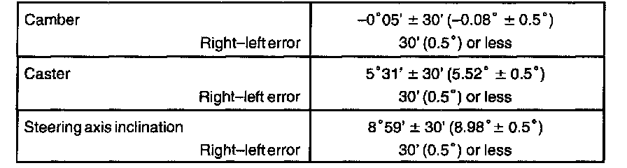 If the caster and steering axis inclination are not within the specified values, after the camber has been correctly adjusted, recheck the suspension parts for damaged and/or worn out parts.