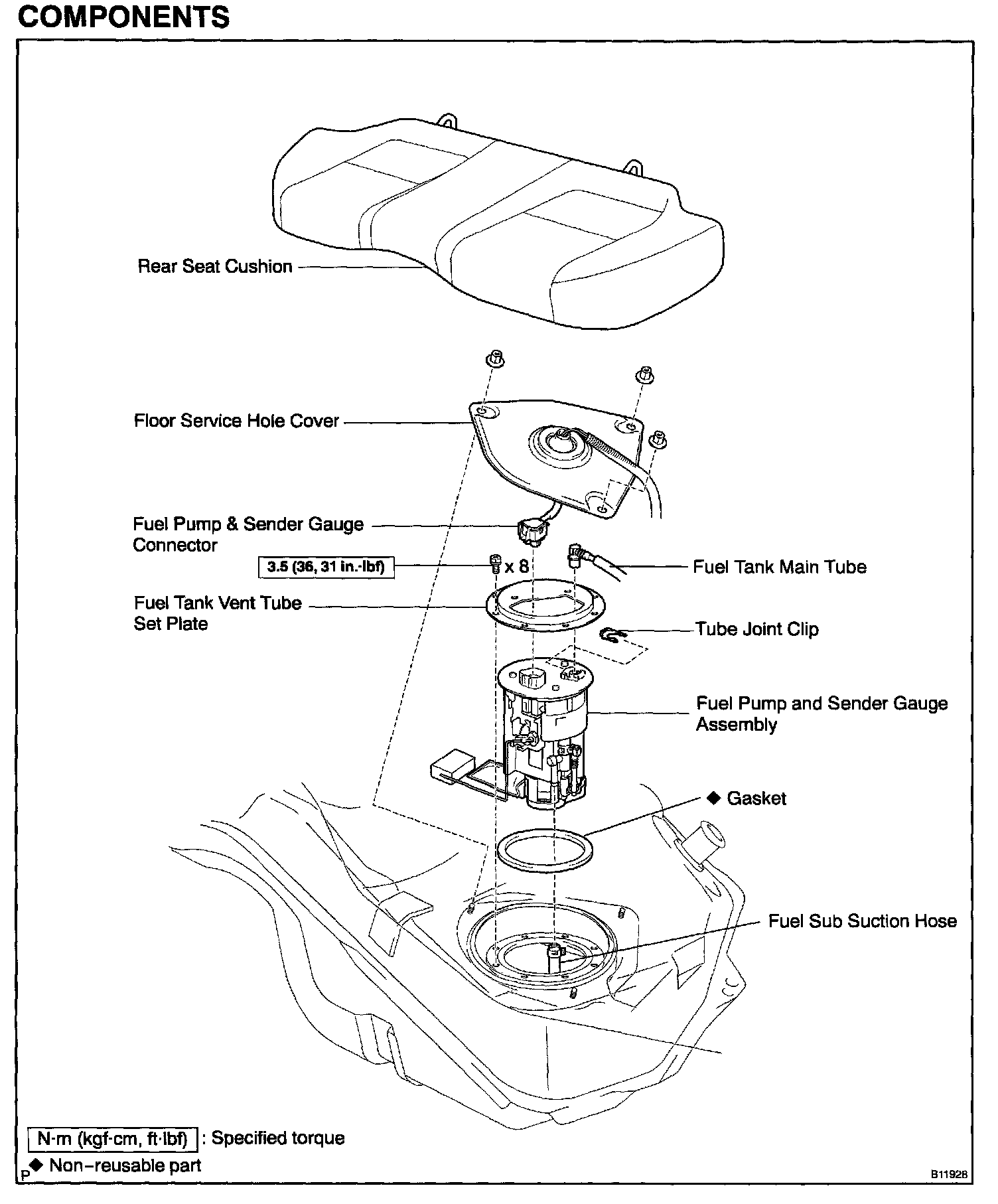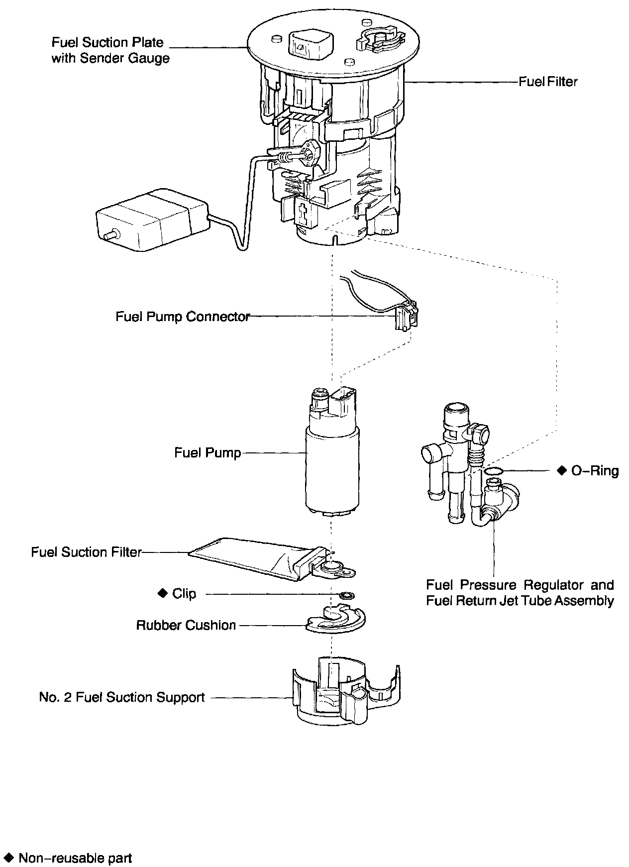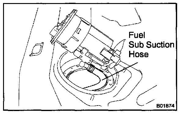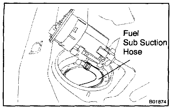 b. Lift up the fuel pump and sender gauge assembly, and disconnect the fuel sub suction hose from the fuel return jet tube and remove the fuel pump, sender gauge assembly and gasket.