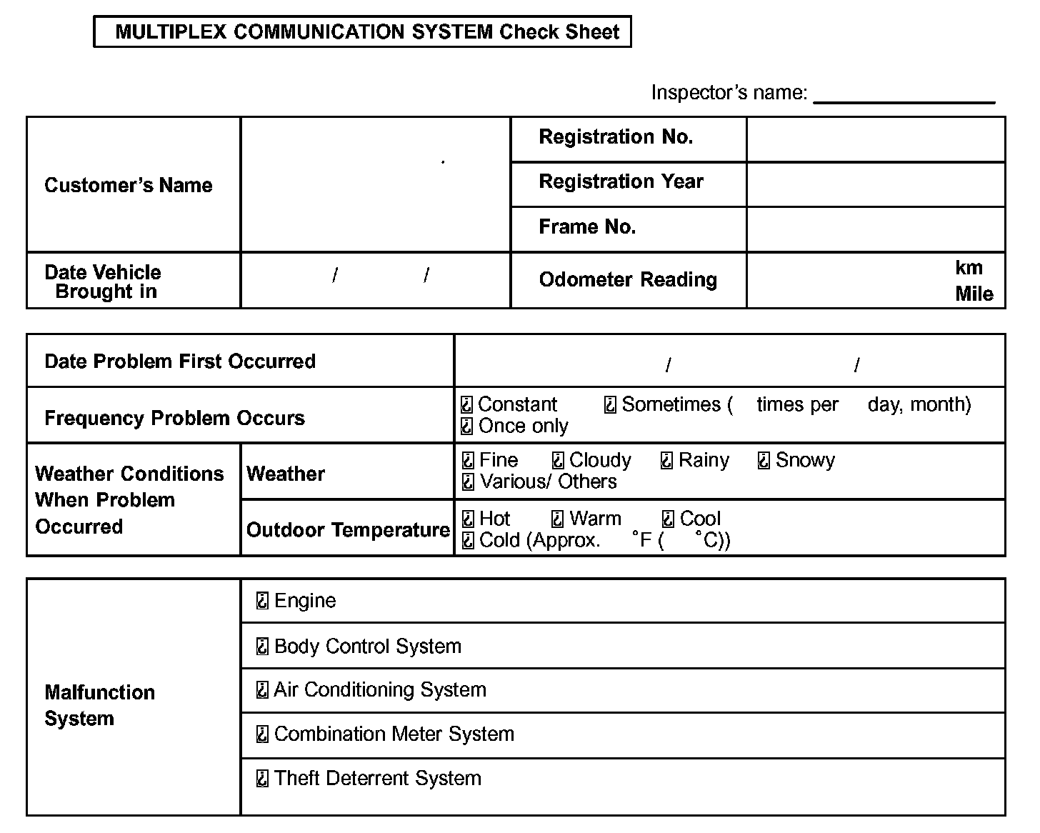 Multiplex Communication System Check Sheet: