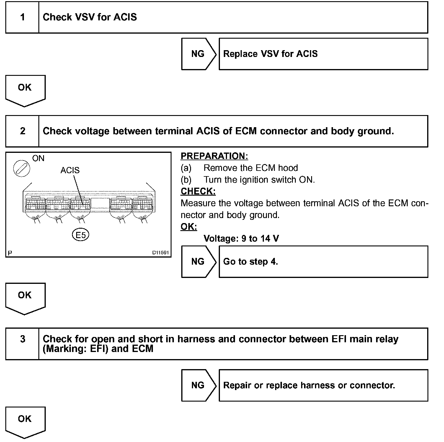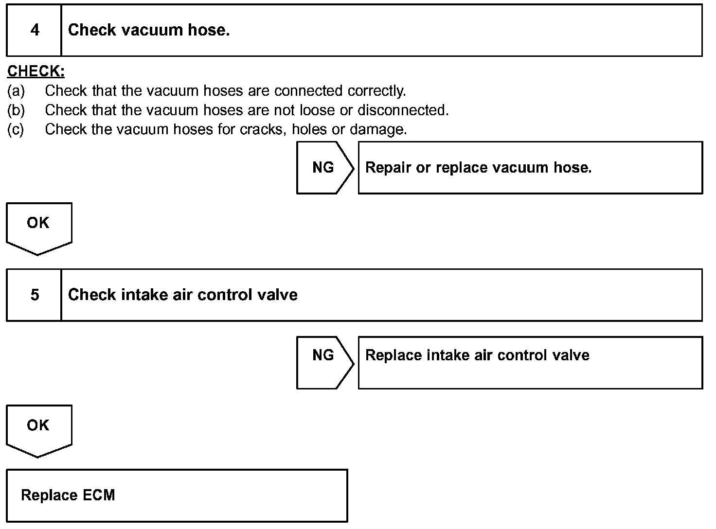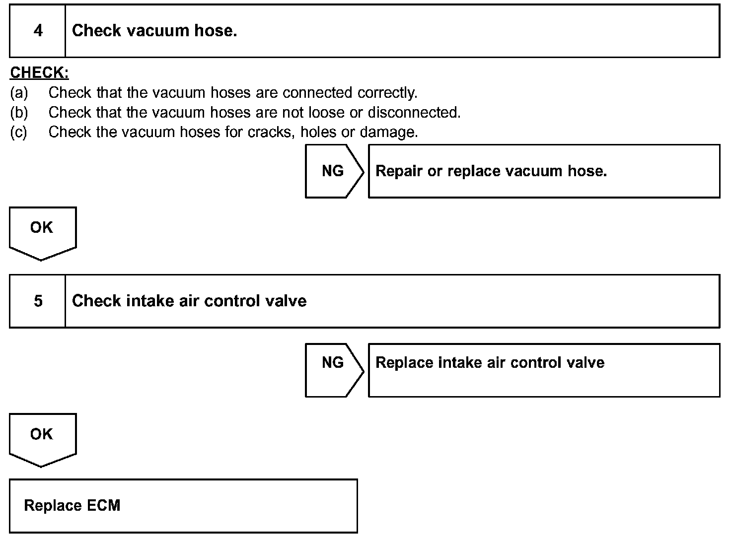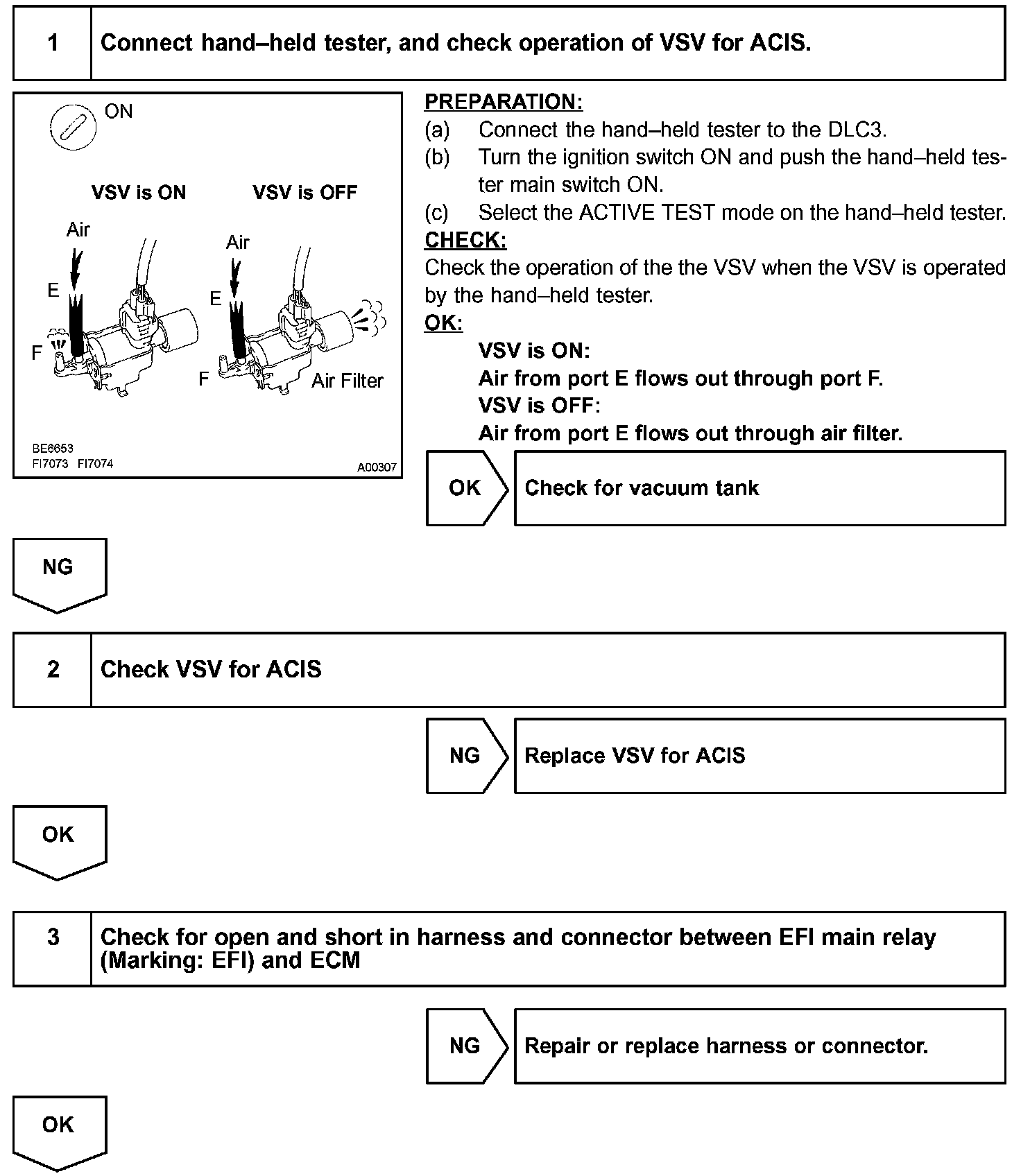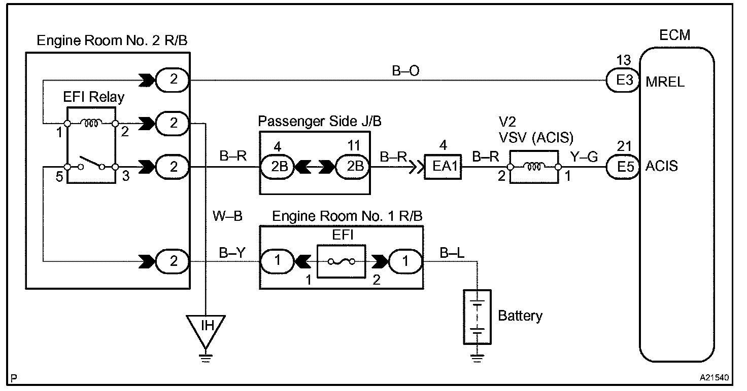 This circuit opens and closes the Intake Air Control Valve (IACV) in response to the engine load in order to increase the intake efficiency. When the engine speed is 4,300 rpm or less and the throttle valve opening angle is 30° or more, the ECM turns the VSV ON and closes the IACV. At all other times, the VSV is OFF, so the IACV is open.