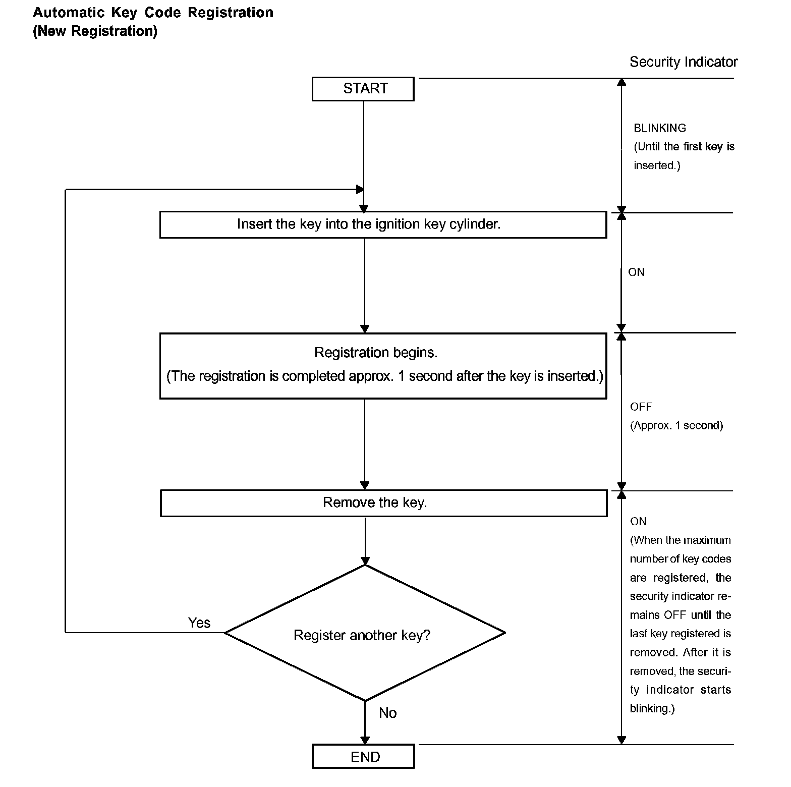 - When no key is inserted into the ignition key cylinder in automatic key code registration mode, the security indicator remains on.