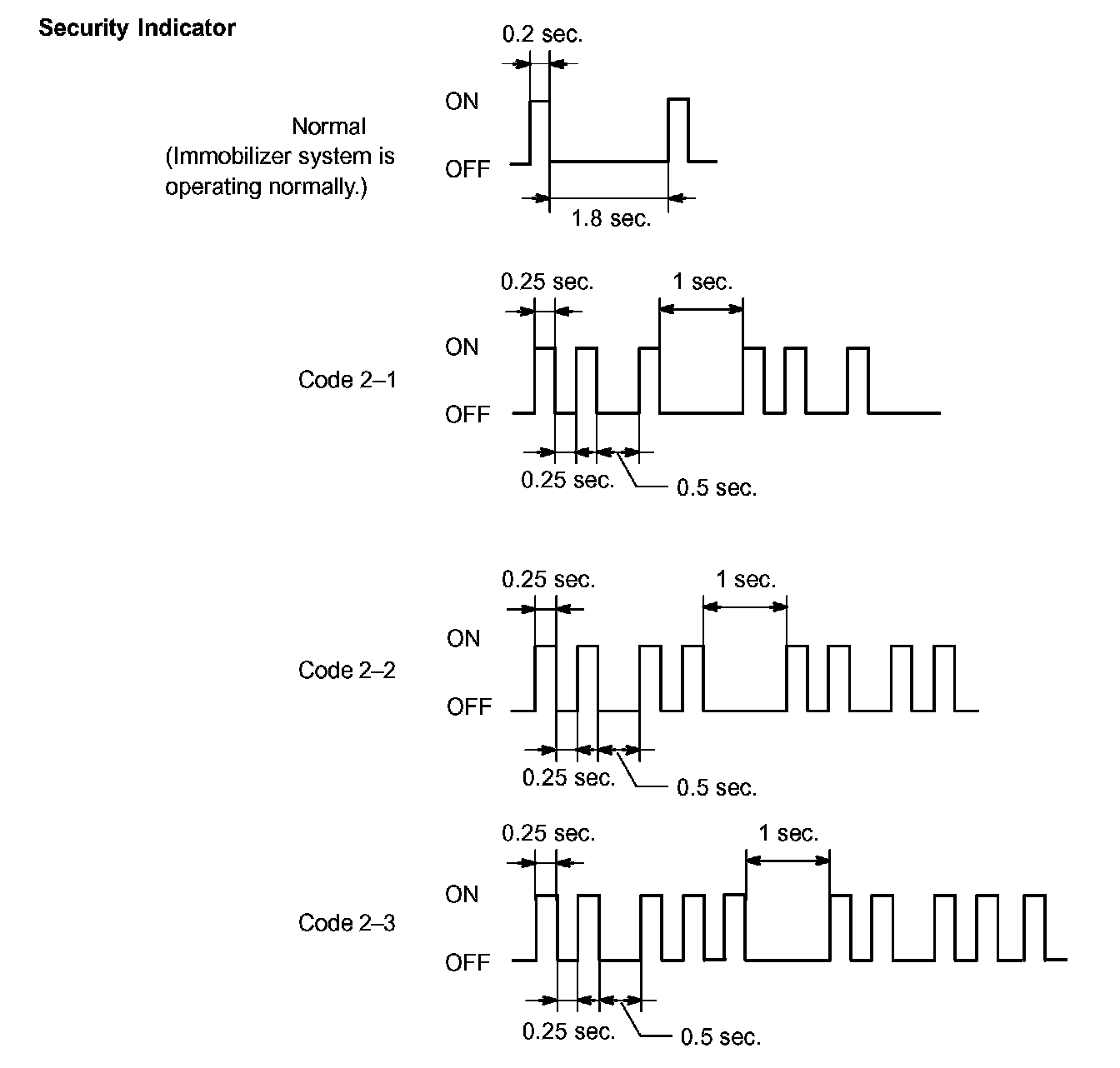 - When the immobilizer system is operating normally and the key is pulled out, the security indicator blinks continuously.