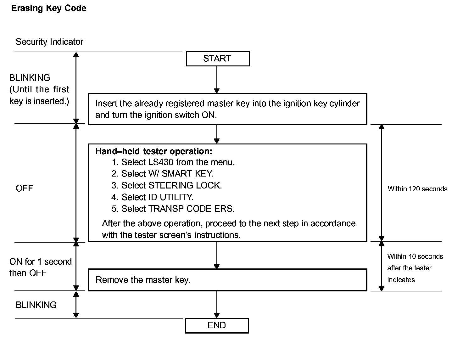 - A brief outline of procedures for key code erasure is shown. For more detailed information, please refer to the hand-held tester screen's instructions.