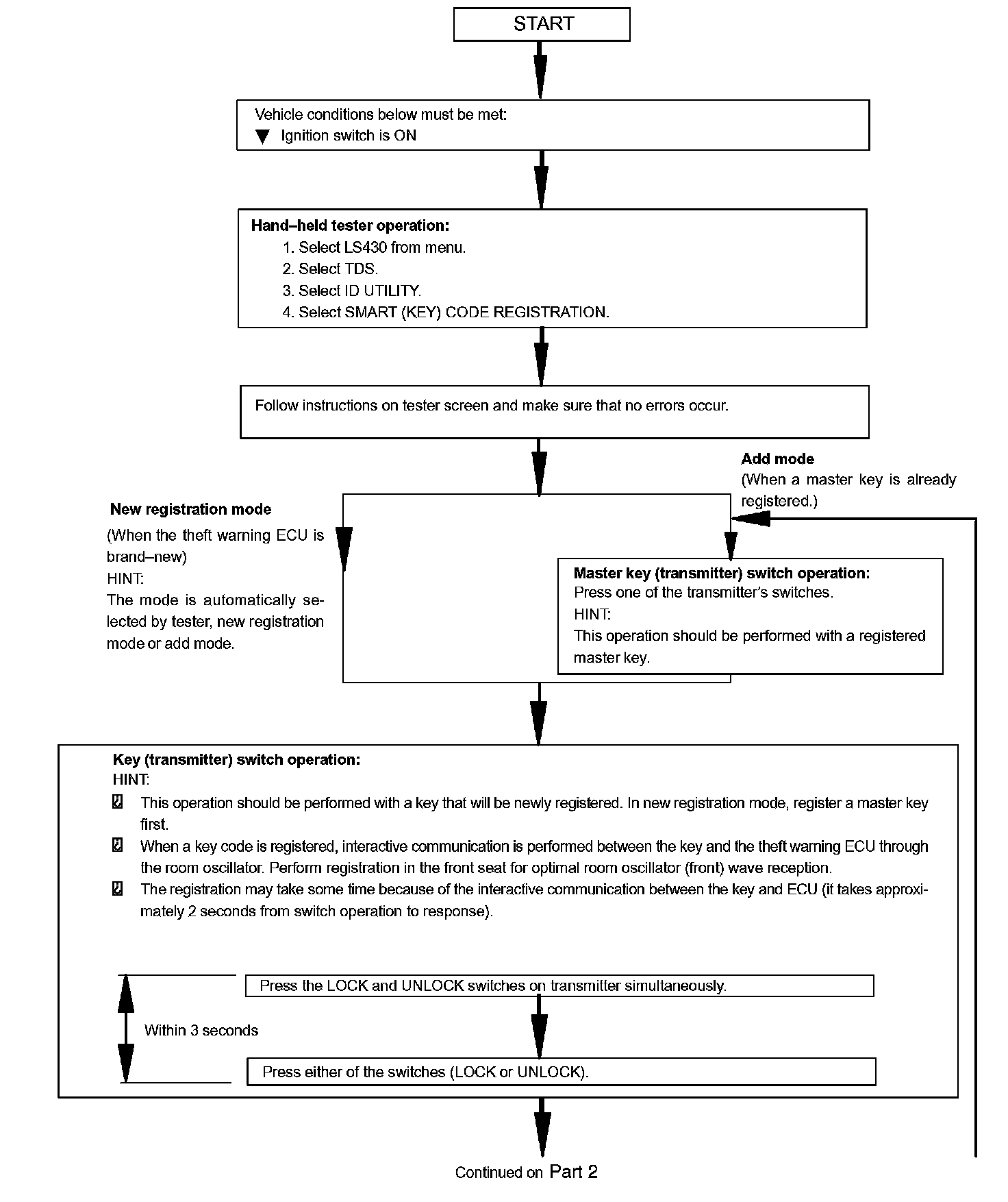 - New registration mode is used when the theft warning ECU is replaced with a new ECU. In this mode, be sure to register a master key code first. Otherwise, you cannot proceed to the add mode for registering other keys. If a sub-key code is registered first, pressing one of the transmitter's switches (master key (transmitter) switch operation in add mode*) to try to make an additional key registration erases the registered sub-key code.