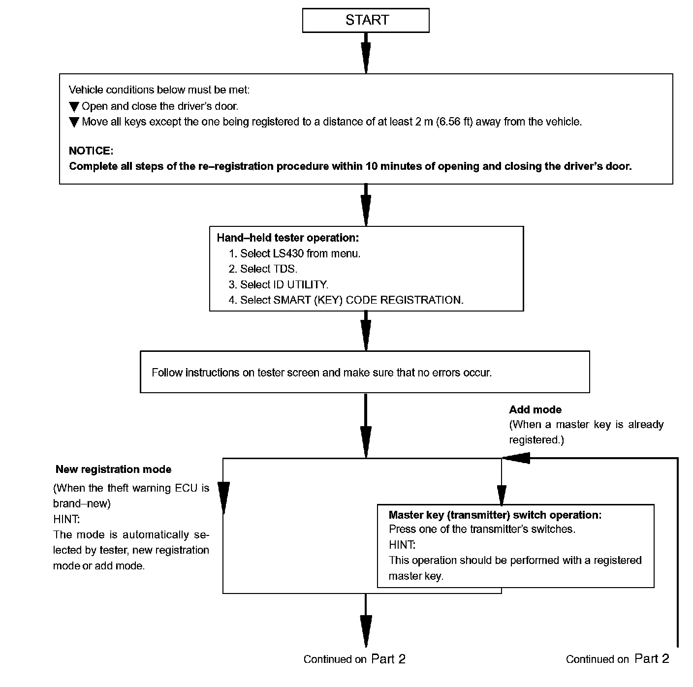 - A brief outline of procedures for key code registration is shown on this page and the previous page. For more detailed information, please refer to the hand-held tester screen's instructions.
