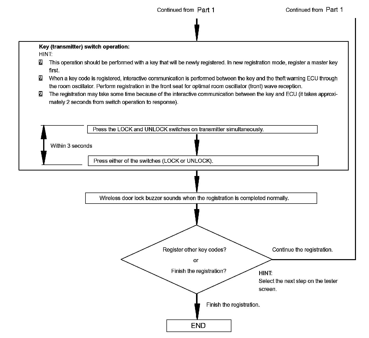 HINT: A brief outline of procedures for key code registration is shown. For more detailed information, please refer to the hand-held tester screen's instructions.