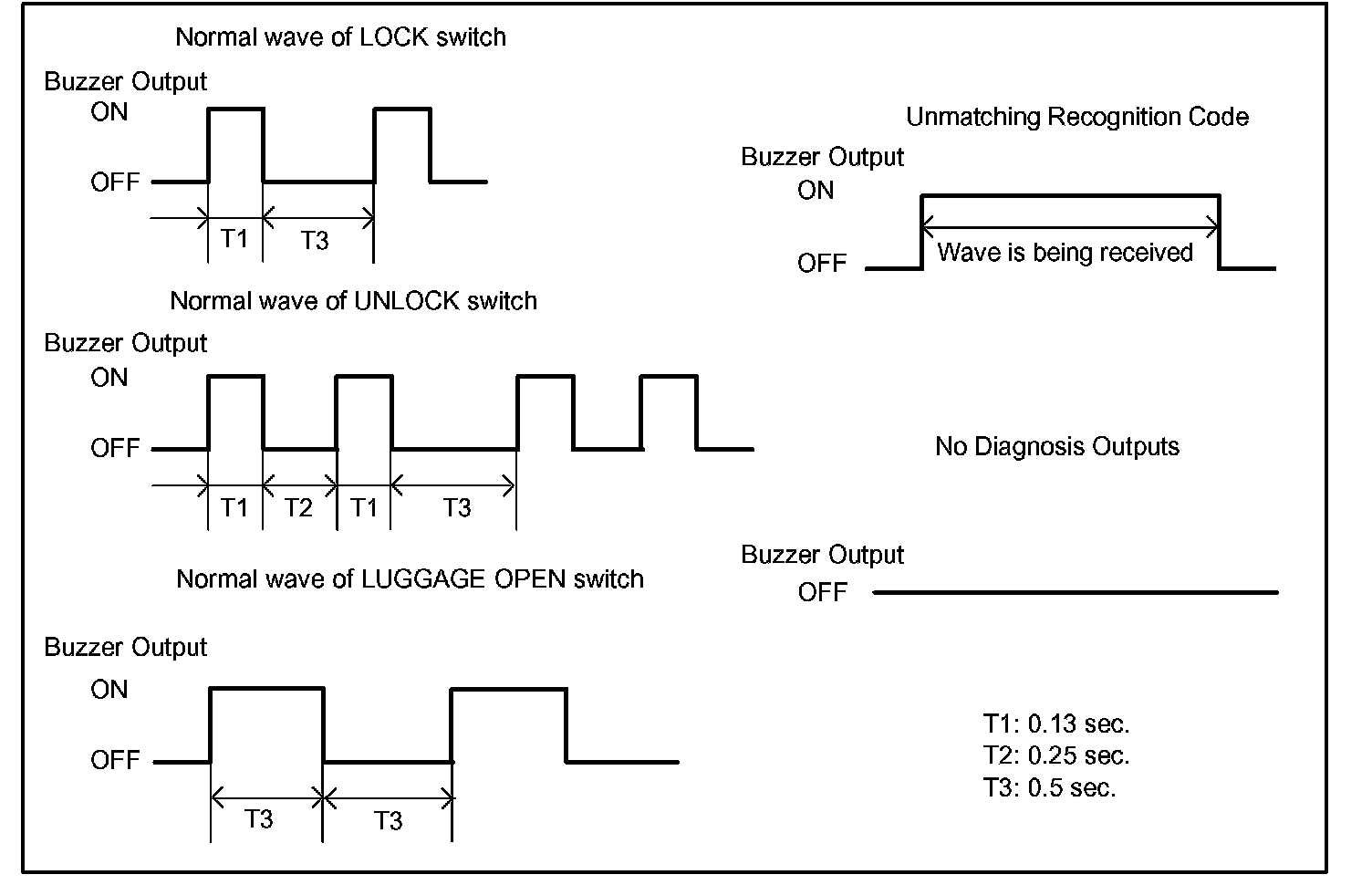 c. Inspect the diagnosis outputs when the door control transmitter switch is held down (the diagnosis outputs can be checked with the sound of the wireless door lock buzzer).