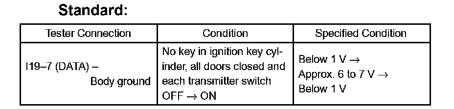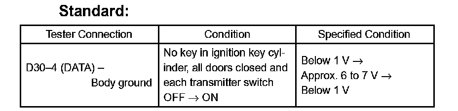 HINT: This mode checks signal transmission/reception between the door control transmitter, door control receiver and theft warning ECU (theft deterrent ECU). If all of customer's door control transmitters do not function, it is possible the door control transmitter(s) and/or wire harness is malfunctioning.