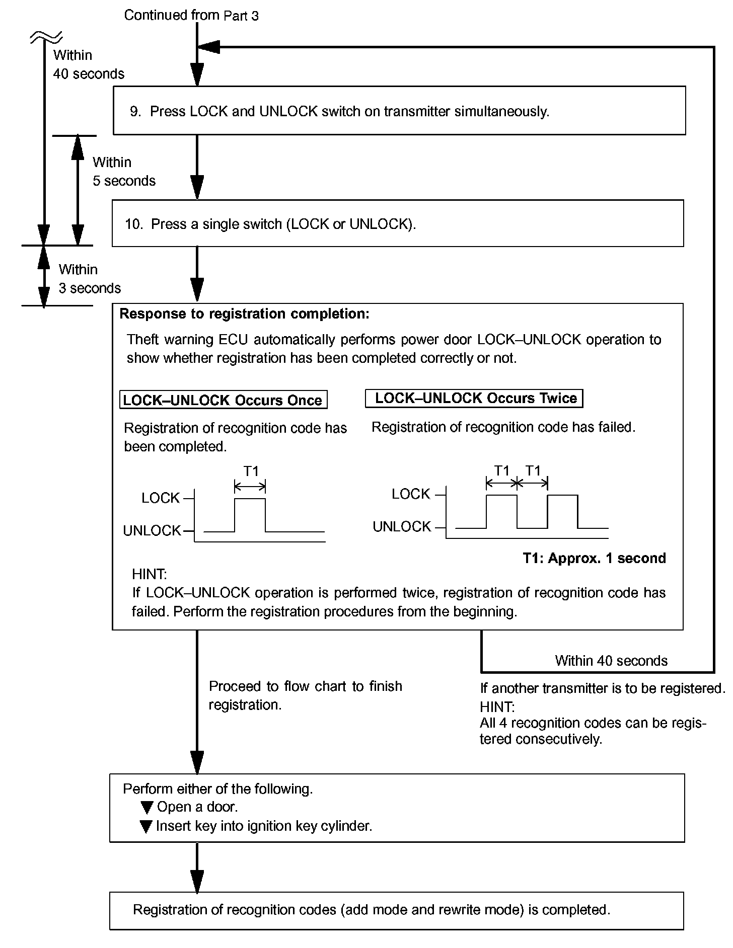 - Add mode is used to register new recognition codes while still retaining codes already registered. This mode is used when a new transmitter is added. If the number of registered codes exceeds 4, the previously registered codes will be erased, starting from the first registered code.