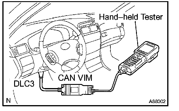 HINT: Connect the cable of the hand-held tester (with CAN VIM) to the DLC3, turn the ignition switch ON and attempt to use the hand-held tester. If the screen displays UNABLE TO CONNECT TO VEHICLE, a problem exists in the vehicle side or the tester side.