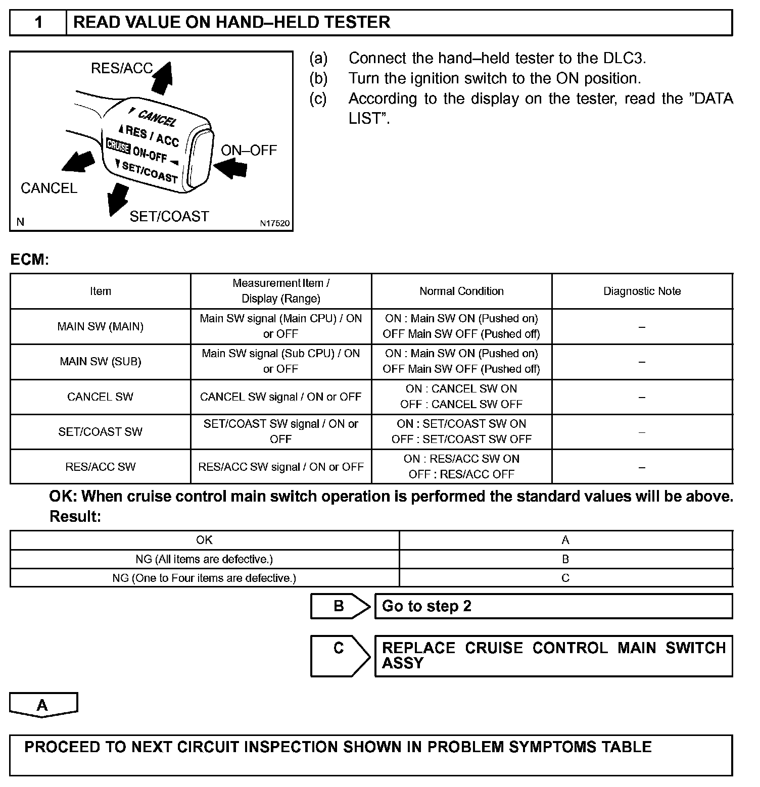 The cruise control main switch operates seven functions: SET, COAST, TAP-DOWN, RESUME, ACCEL, TAP-UP, and CANCEL. The SET, TAP-DOWN and COAST functions, and the RESUME, TAP-UP and ACCEL functions are operated with the same switch respectively. The cruise control main switch is an automatic return type switch which turns on only while operating it in each arrow direction and turns off after releasing it. The internal contact point of the cruise control main switch is turned on with the switch operation. Then the ECM reads the resistance value that has been changed by the switch operation to control SET, COAST, RESUME, ACCEL and CANCEL.