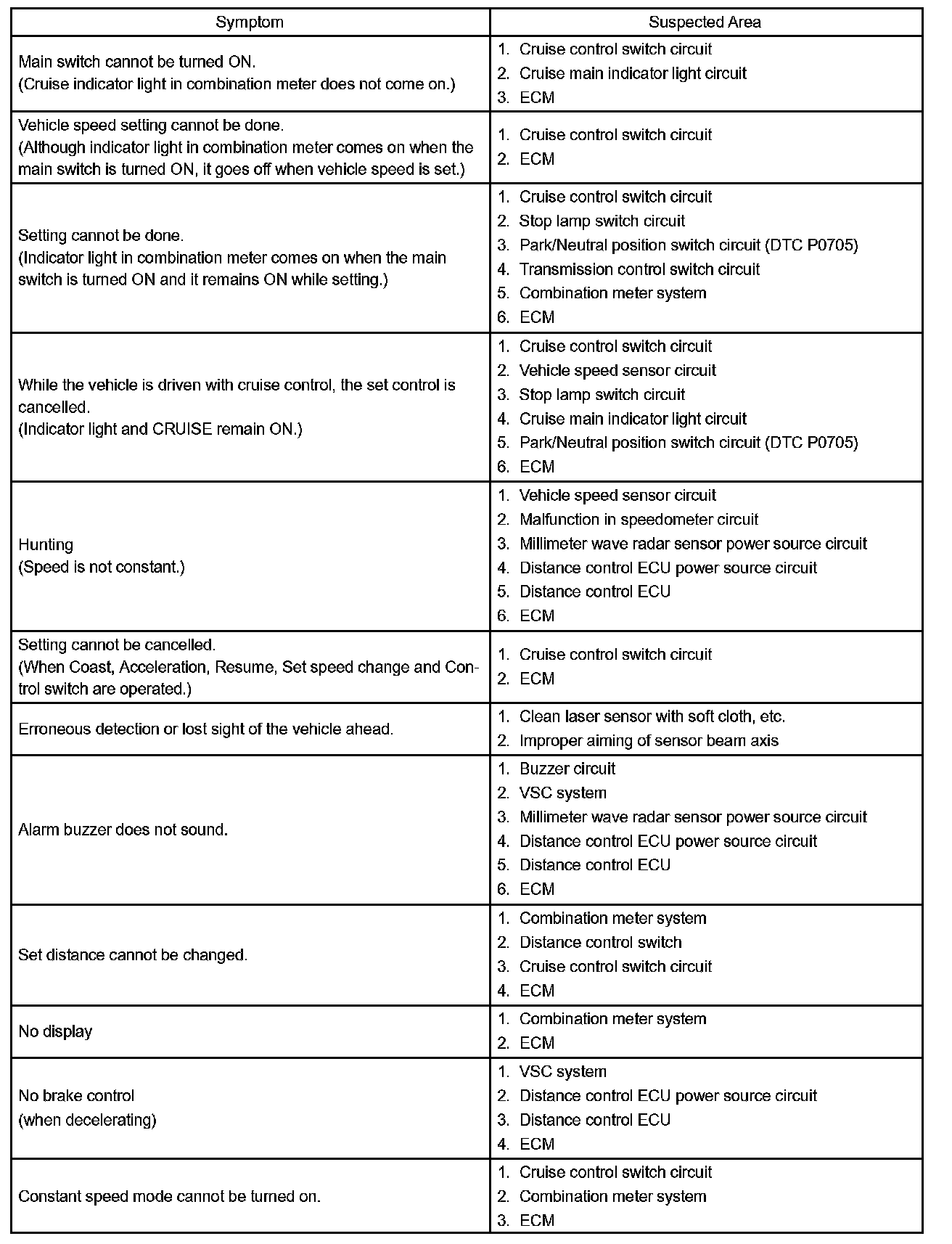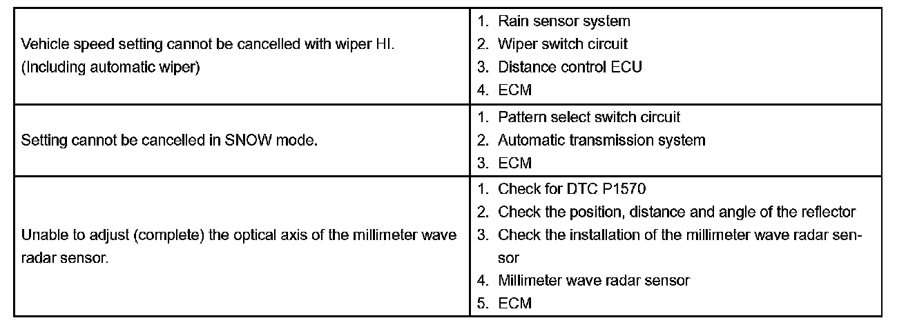 If a normal system code is displayed during the DTC check but the problem still occurs, check the suspected areas for each problem symptom in the order given in the table and proceed to the relevant troubleshooting.