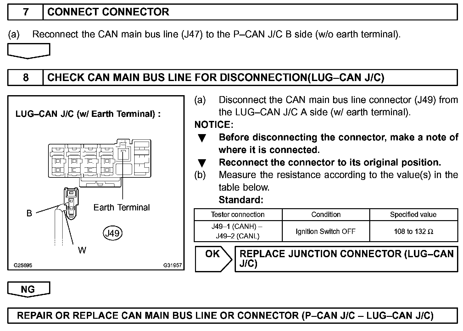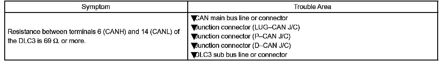 There may be an open circuit in the CAN main bus line and/or the DLC3 sub bus line when the resistance between terminals 6 (CANH) and 14 (CANL) of the DLC3 is 69 Ohm or more.