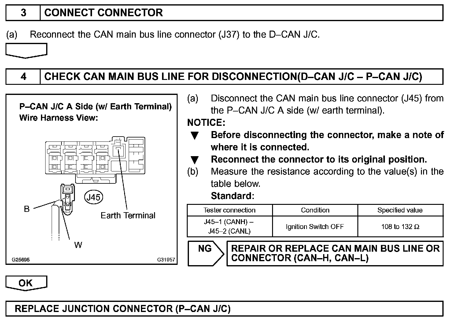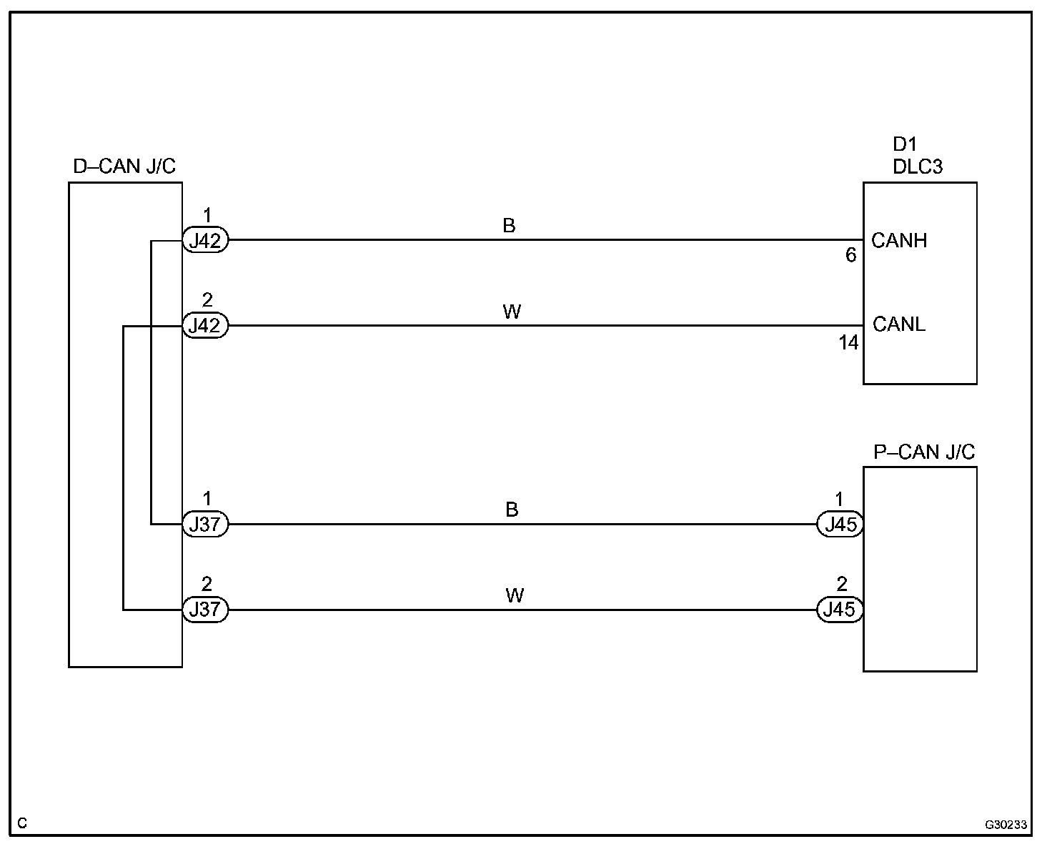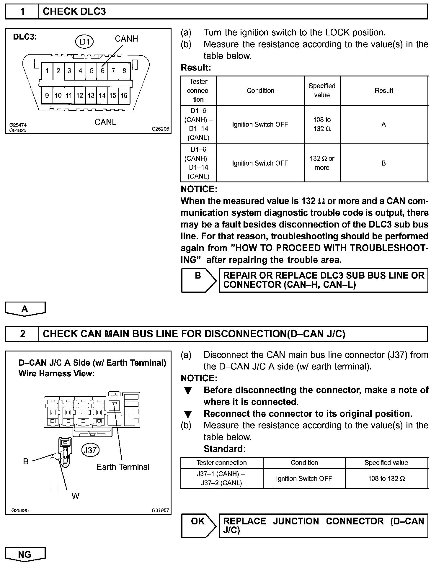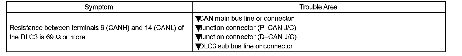 There may be an open circuit in the CAN main bus line and/or the DLC3 sub bus line when the resistance between terminals 6 (CANH) and 14 (CANL) of the DLC3 is 69 Ohm or more.