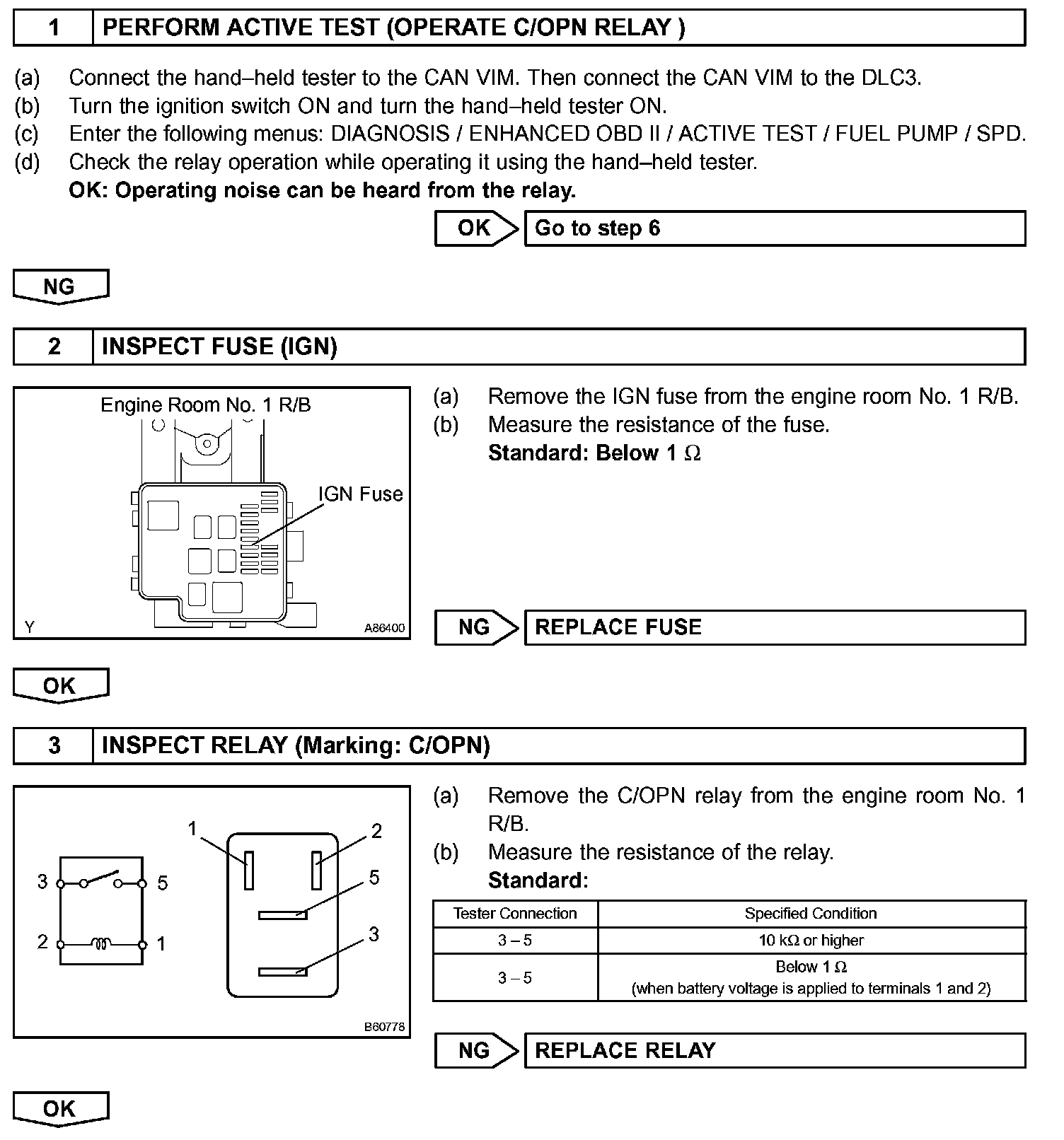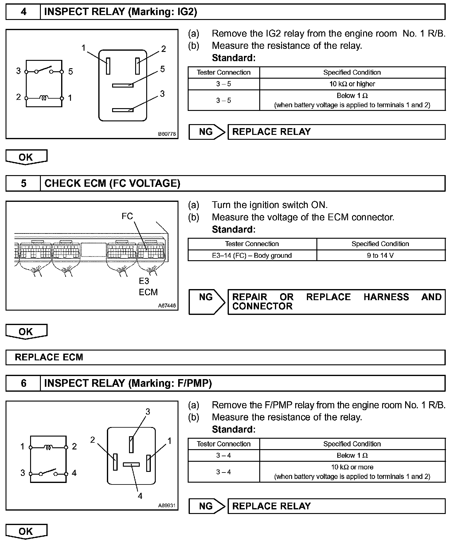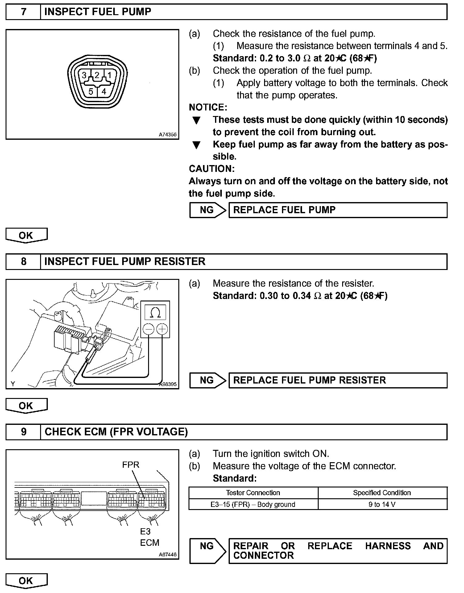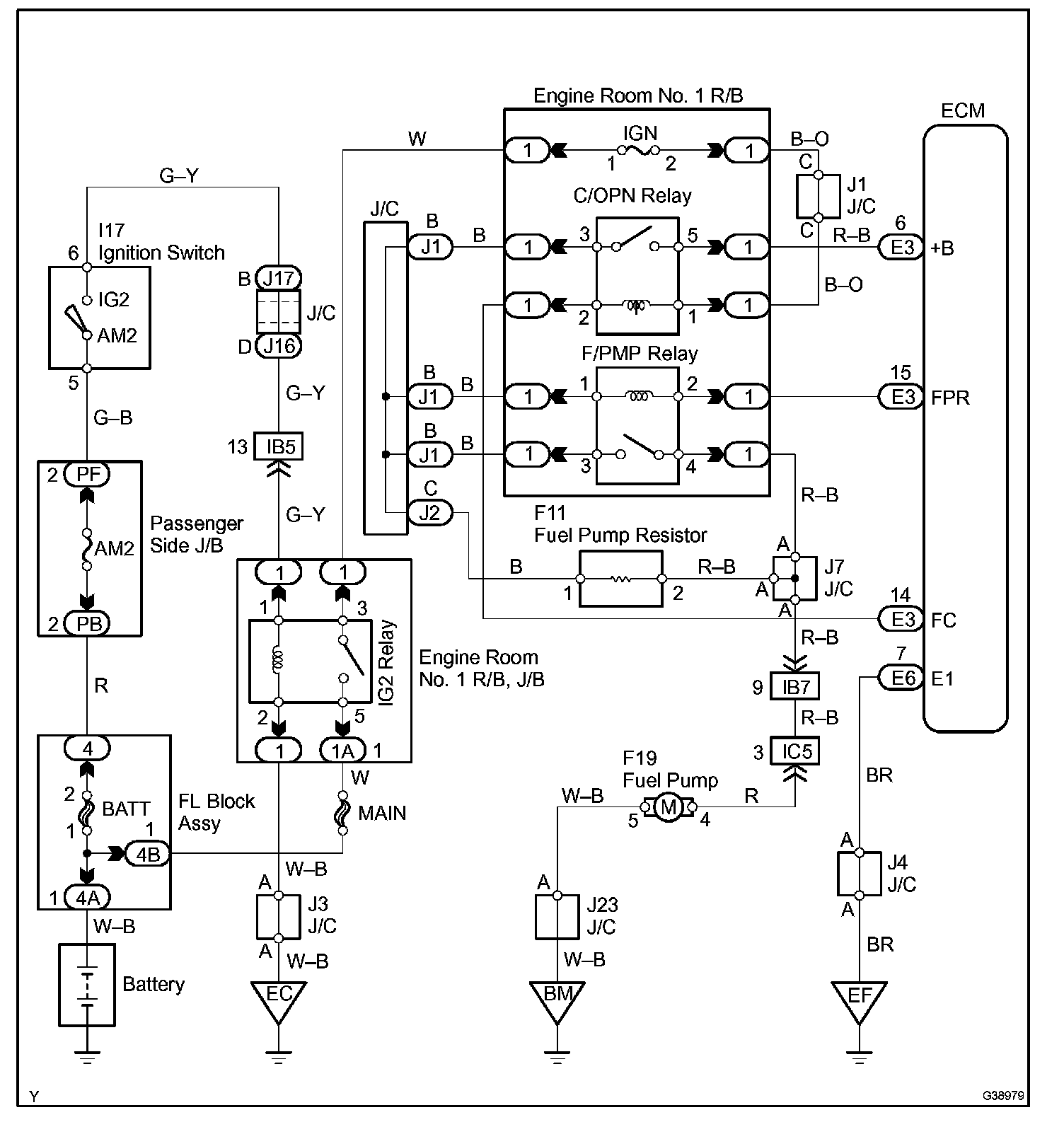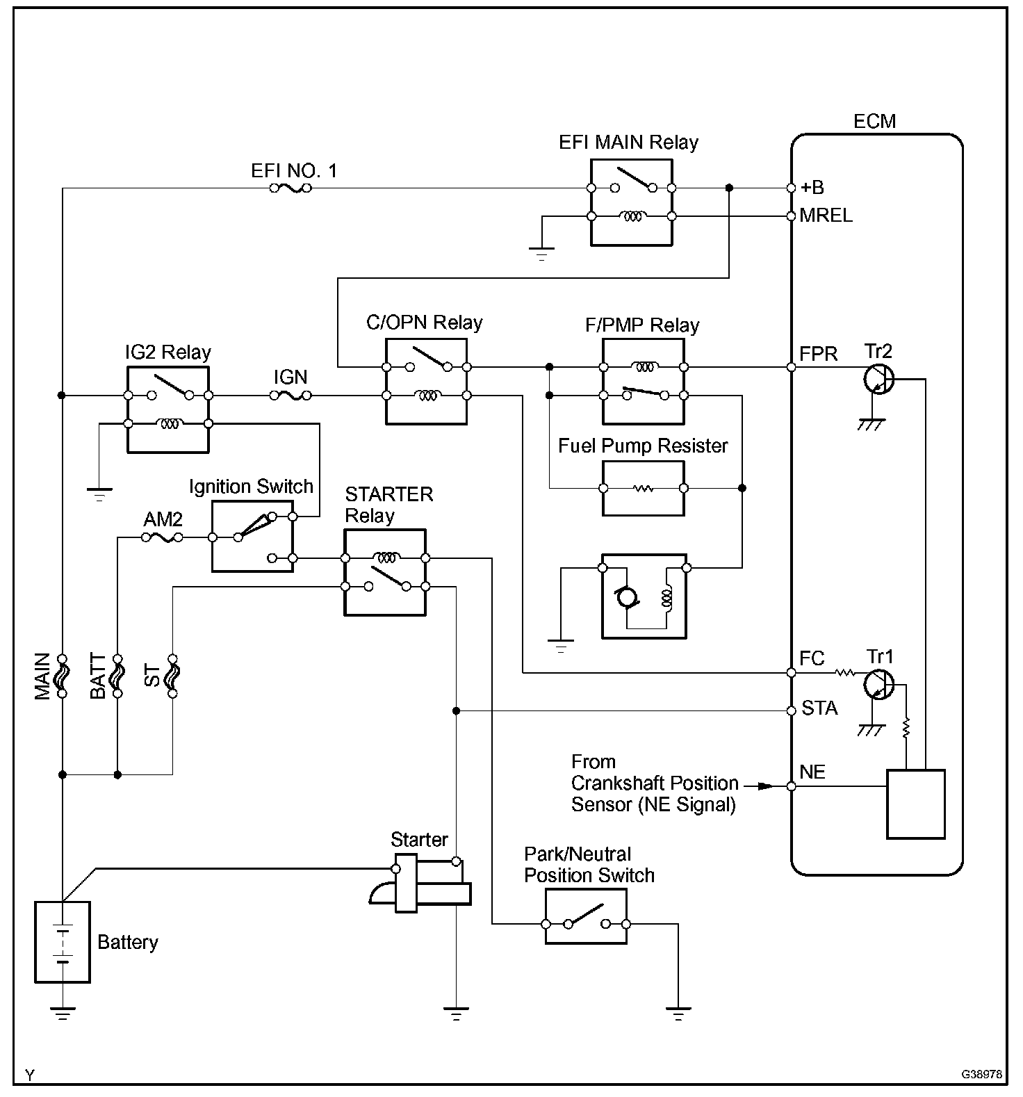 The fuel pump operates at high speed when: 1) the engine starts and the STA signal is ON; and 2) Transistor 2 (Tr2) of the ECM is OFF, causing the fuel pump relay (Marking: F/PMP) to close and battery positive voltage to be applied directly to the fuel pump.
