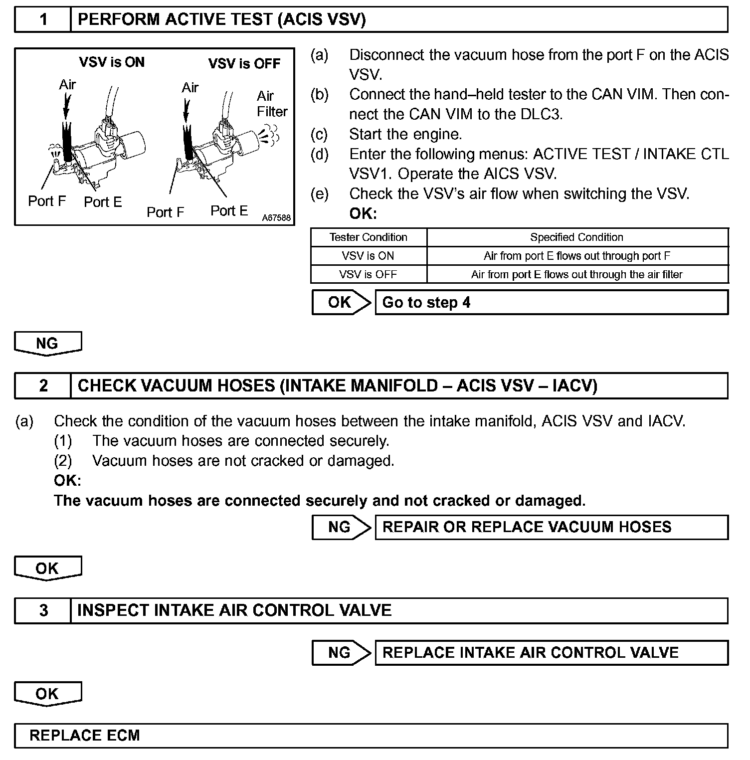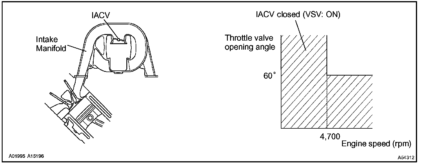 When the engine speed is 4,700 rpm or more and the throttle valve opening angle is 60 ° or more, the IACV is open (VSV: OFF). At all other times, the IACV is closed (VSV: ON).
