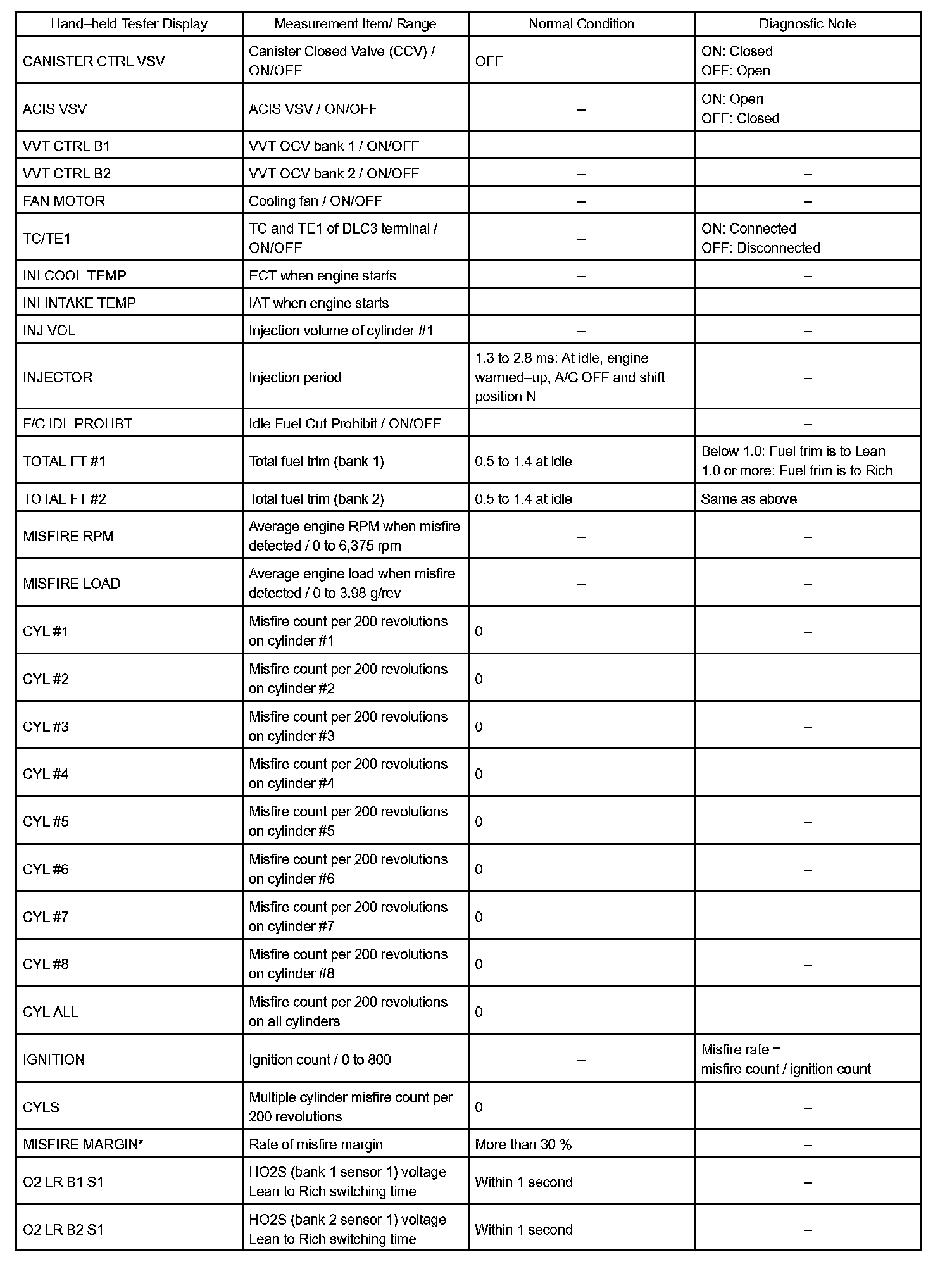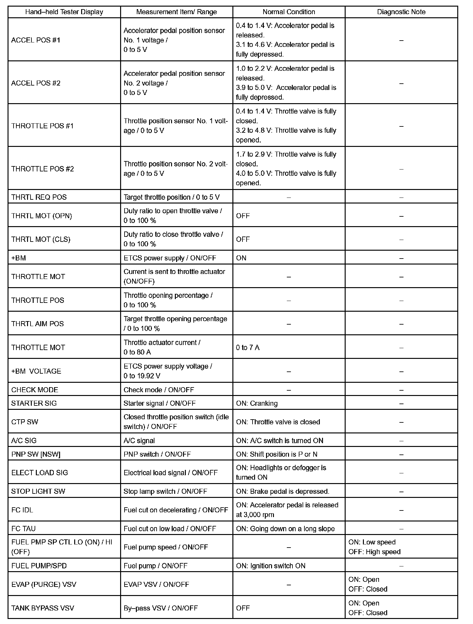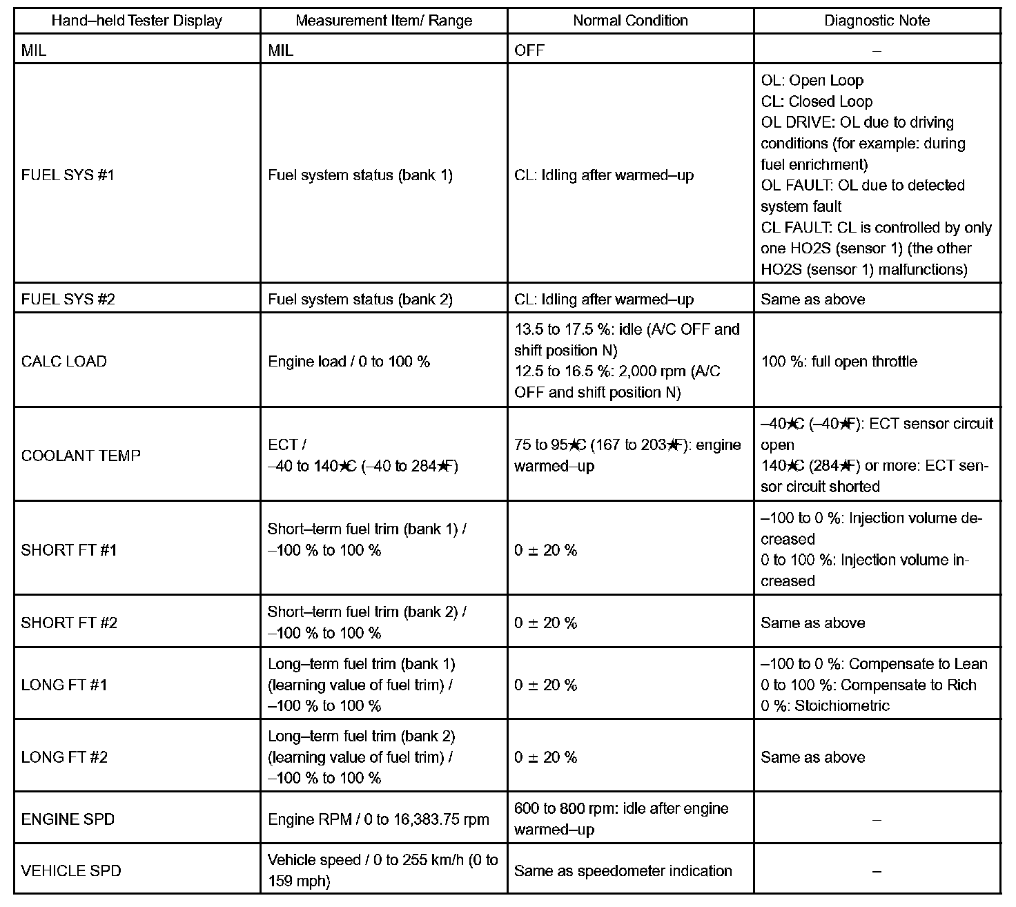 READ DATA LISTHINT: Using the hand-held tester's DATA LIST allows switch, sensor, actuator and other item values to be read without removing any parts. Reading the DATA LIST early in troubleshooting is one way to save time.