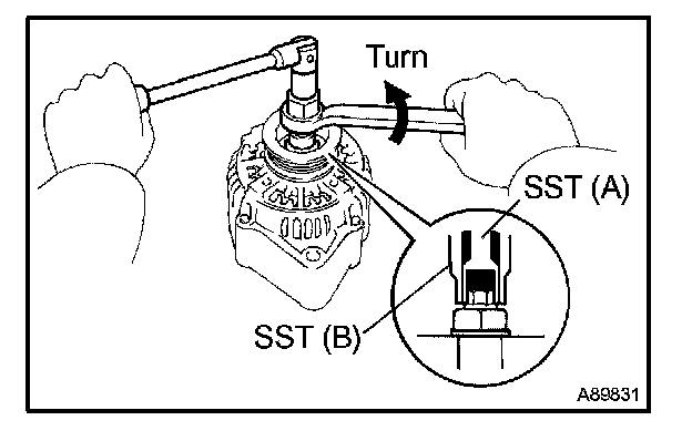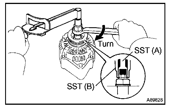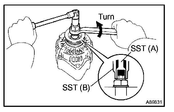 b. Hold SST (A) with a torque wrench, and tighten SST (B) clockwise to the specified torque.