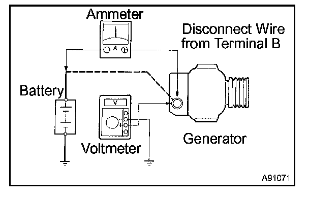1. Disconnect the wire from terminal B of the generator and connect it to the negative (-) lead of the ammeter.