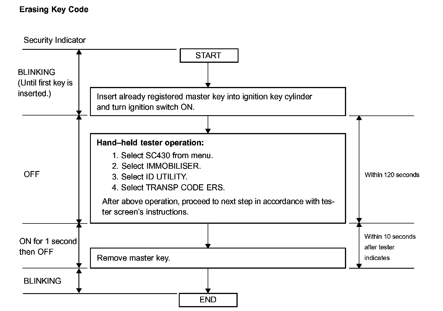- A brief outline of the procedures for key code erasure are shown. For more detailed information, please refer to the hand-held tester screen's instructions.