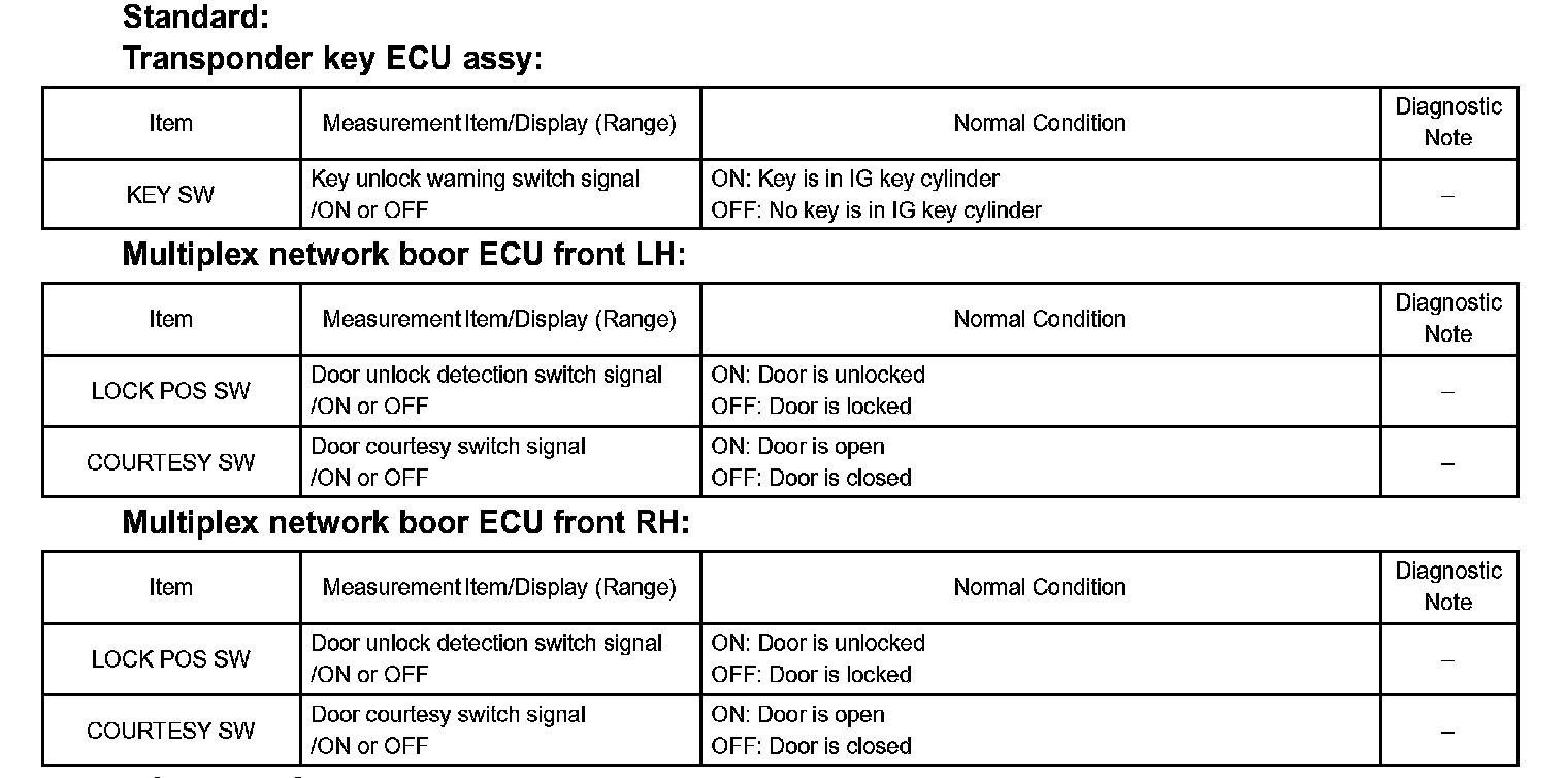 DATA LISTHINT: Using the hand-held tester's DATA LIST allows switch, sensor, actuator and other item values to be read without removing any parts. Reading the DATA LIST early in troubleshooting is one way to save time.