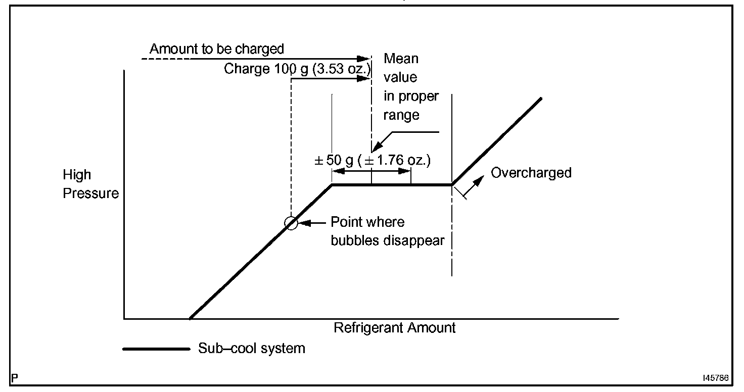 - Approximately 100 g (3.53 oz.) of refrigerant may need to be charged after bubbles disappear. The refrigerant amount should be checked by quantity, not with the sight glass.