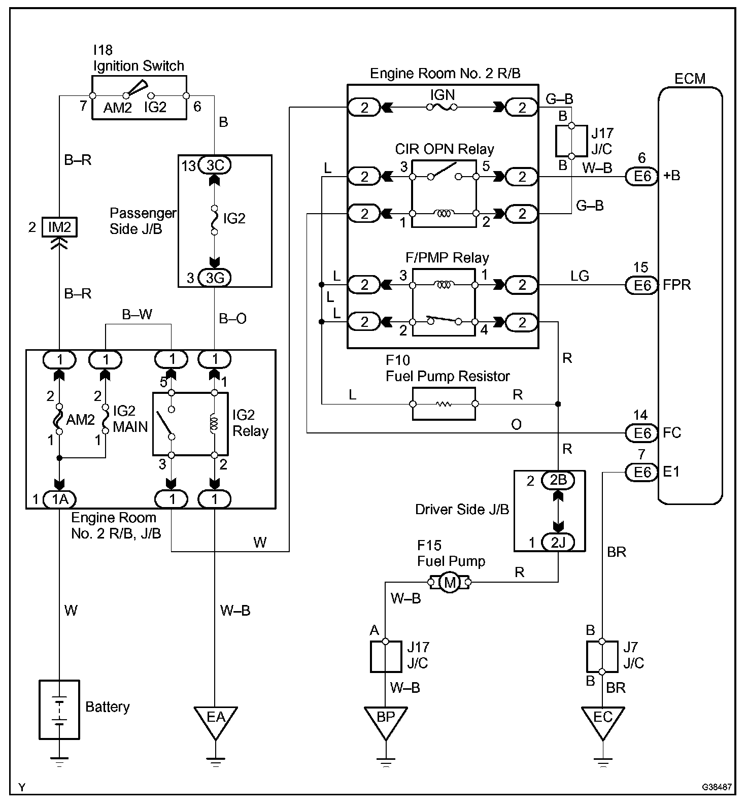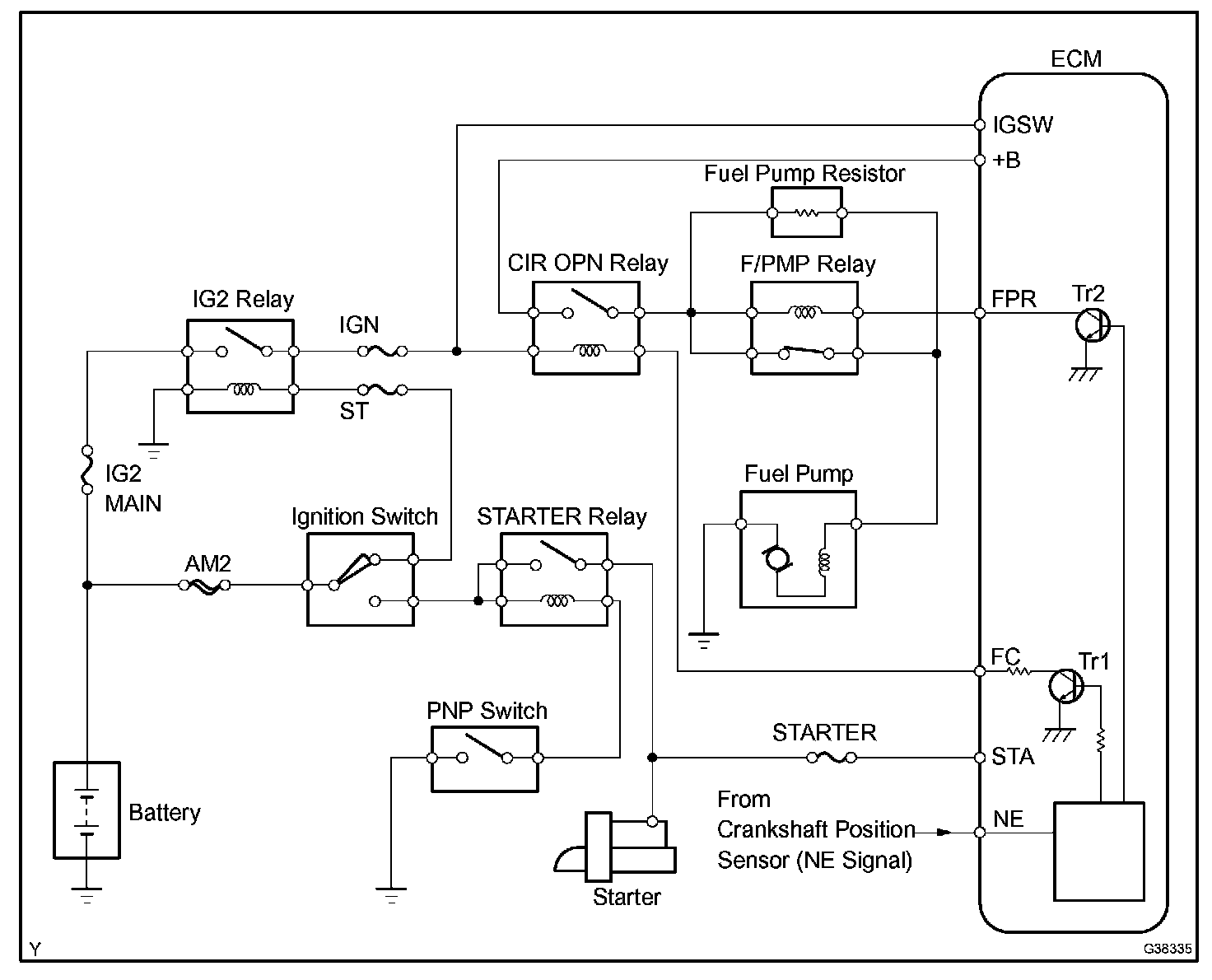 The fuel pump operates at high speed when: 1.the engine starts and the STA signal is ON; and 2.Transistor 2 (Tr2.of the ECM is OFF, causing the fuel pump relay (Marking: F/PMP) to close and battery positive voltage to be applied directly to the fuel pump.