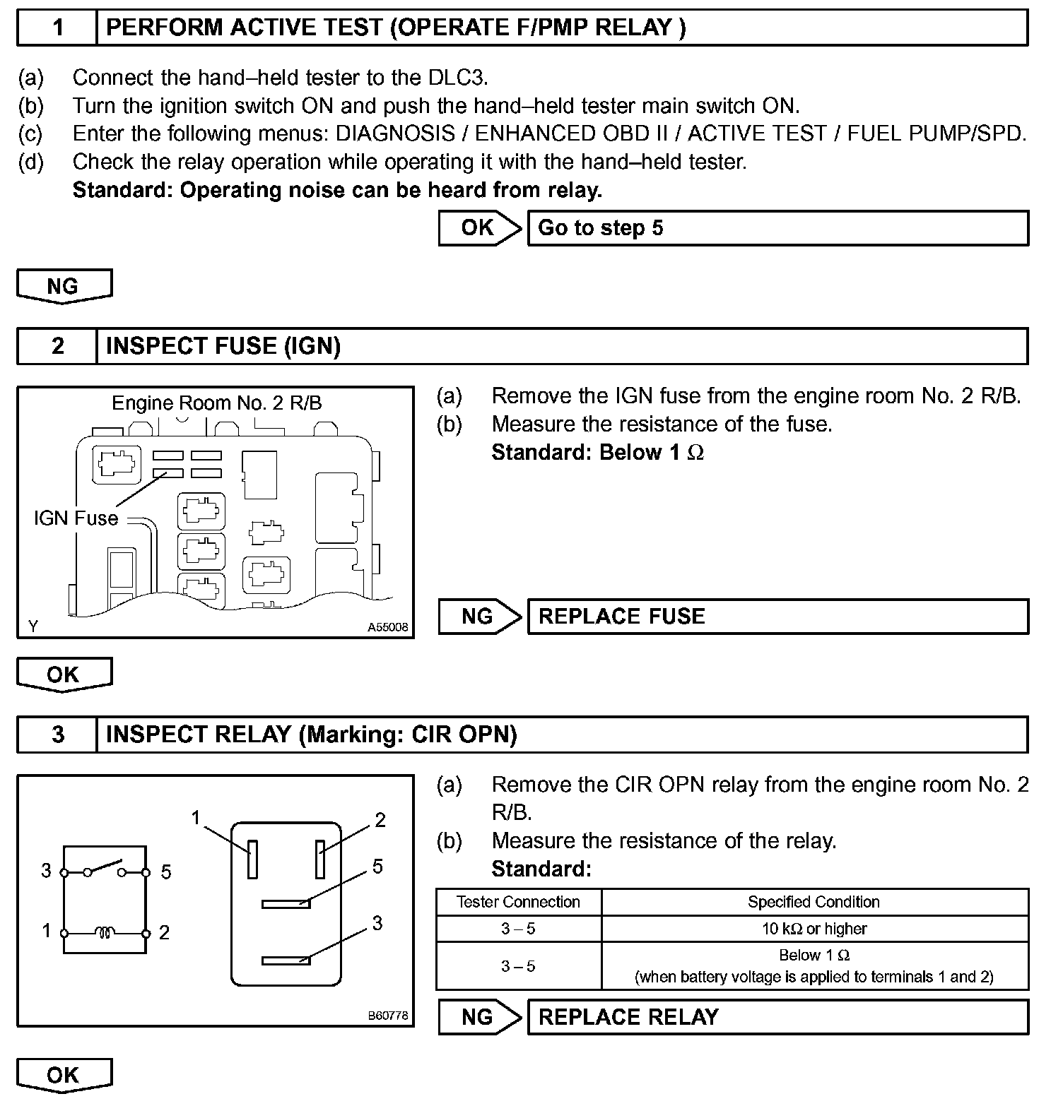 When the engine is cranked, current flows from terminal ST of the ignition switch to the starter relay coil and also current flows to terminal STA of the ECM (STA signal). When the STA signal and NE signal are input to the ECM, Transistor 1 (Tr1.of the ECM is turned ON, current flows to the coil of the circuit opening relay (Marking: CIR OPN), the relay switches on, power is supplied to the fuel pump, and the fuel pump operates. While the NE signal is generated (engine running., the ECM keeps Tr1 ON (circuit opening relay ON) and the fuel pump also keeps operating.The fuel pump speed is controlled at two levels (high speed or low speed.by the condition of the engine (starting, light load, heavy load).