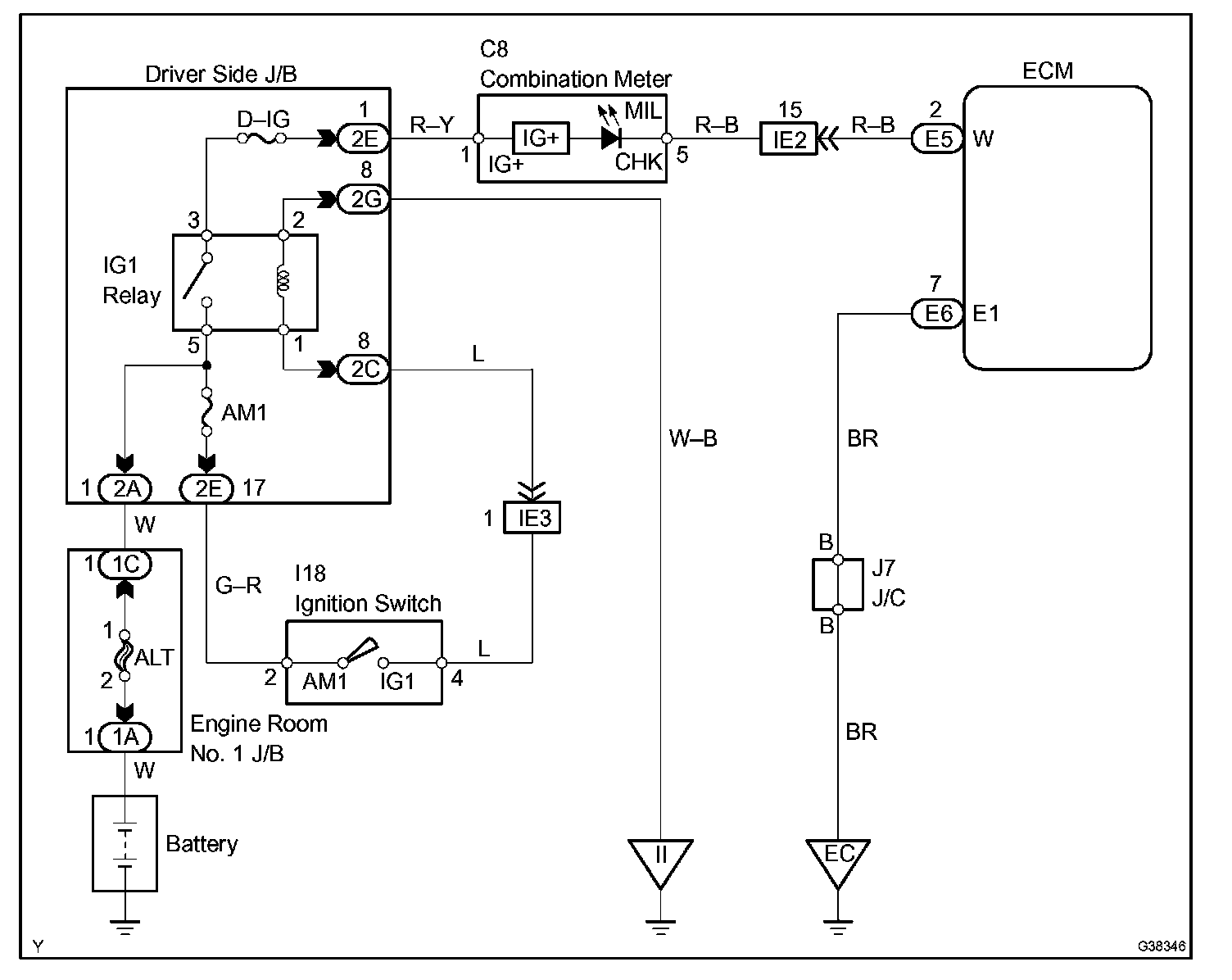 The Malfunction Indicator Lamp (MIL) is used to indicate the ECM's detection of a vehicle malfunction. The instrument panel GAUGE fuse provides the circuit with power and the ECM provides the circuit ground that illuminates the MIL.