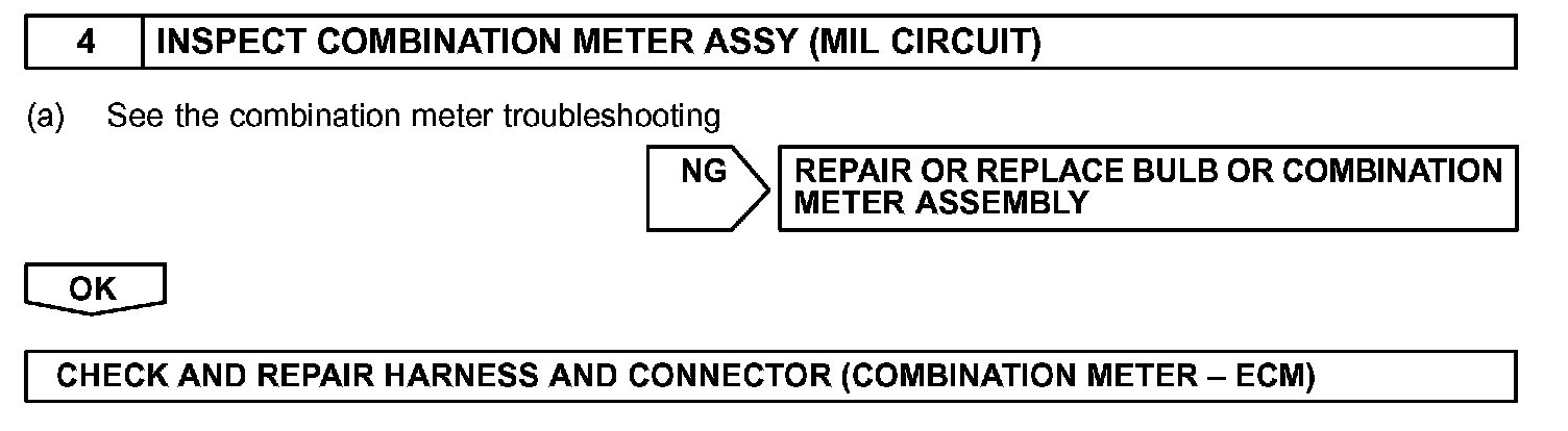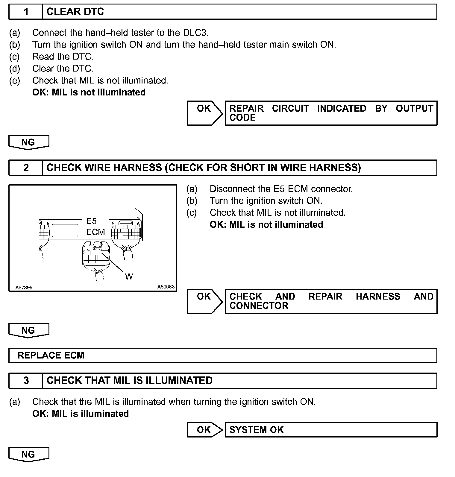 If the ECM detects trouble, the MIL illuminates. At this time, the ECM records a DTC in the memory.