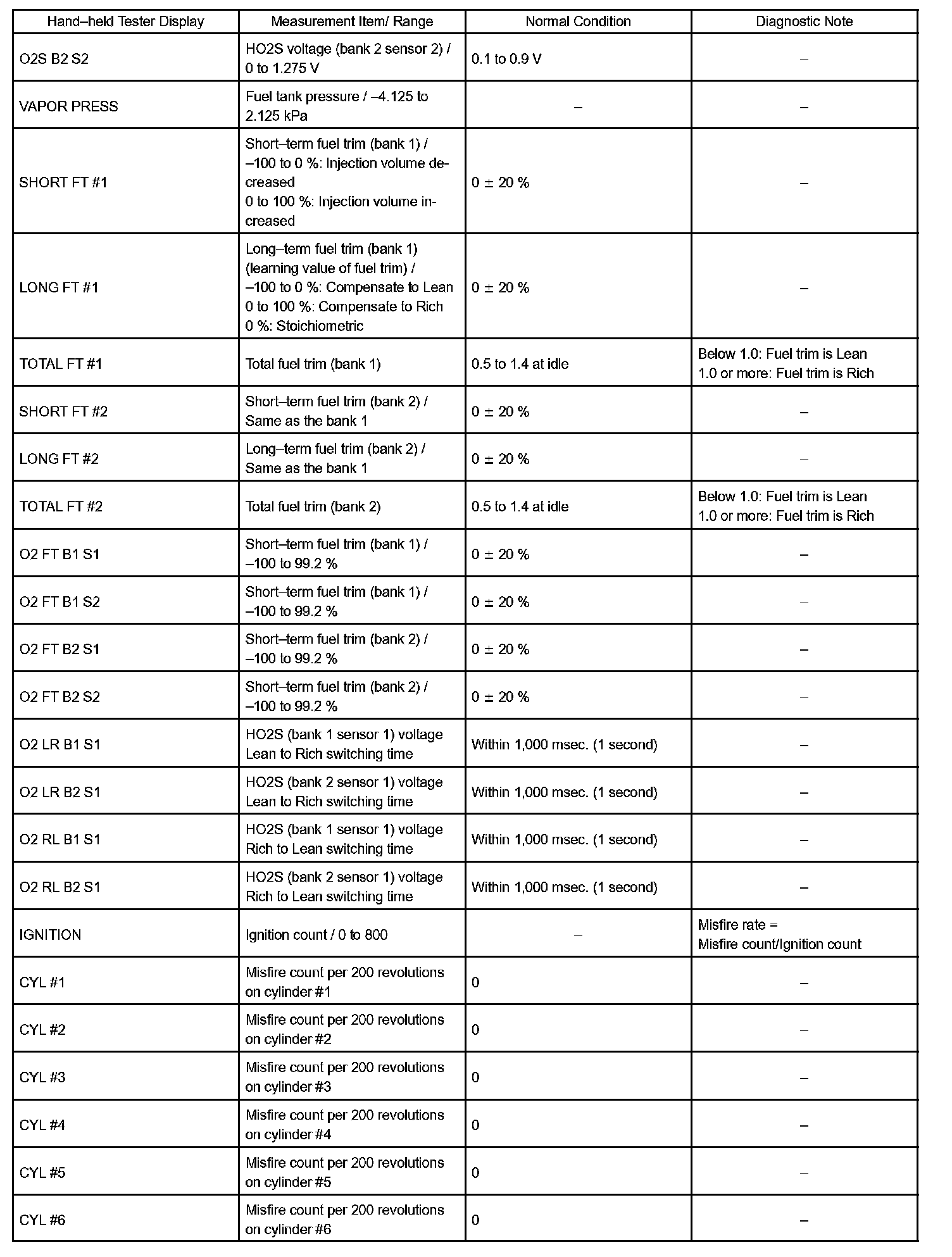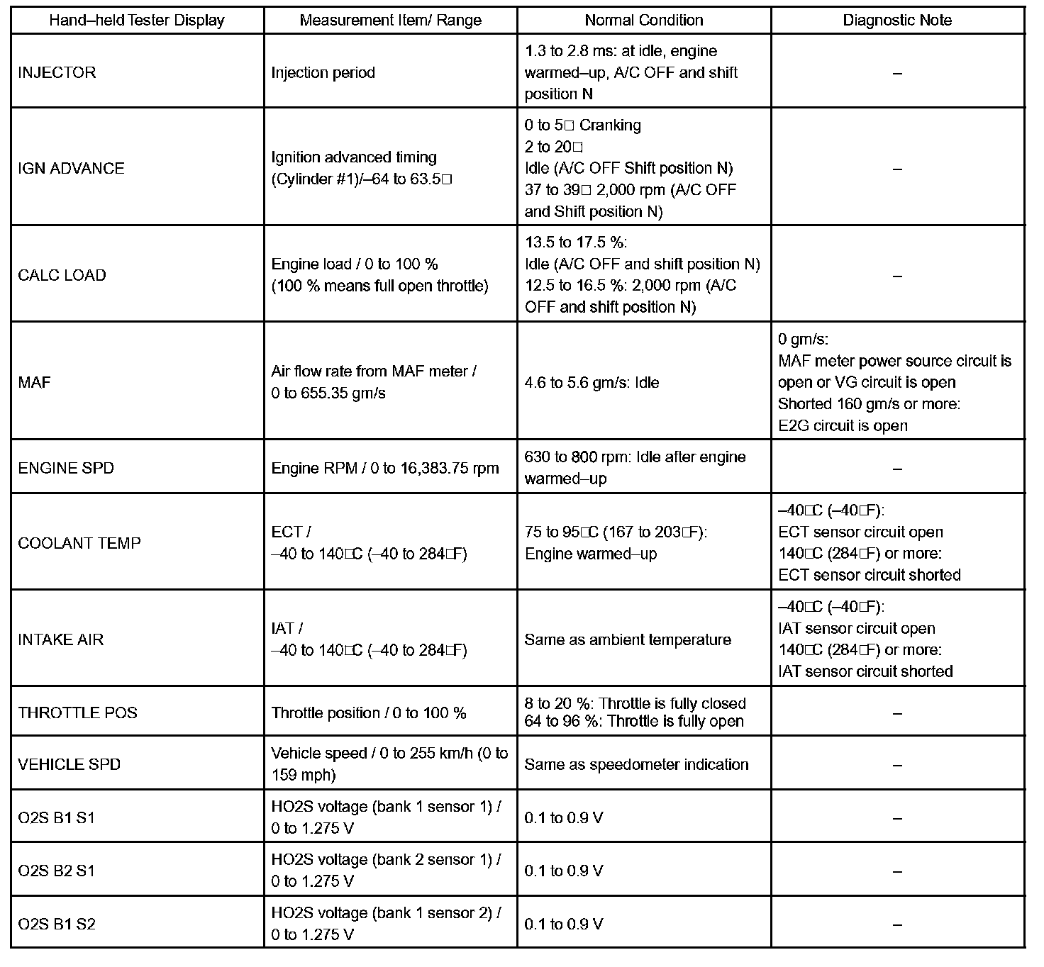DATA LISTHINT: Using the hand-held tester's DATA LIST allows switch, sensor, actuator and other item values to be read without removing any parts. Reading the DATA LIST early in troubleshooting is one way to save time.
