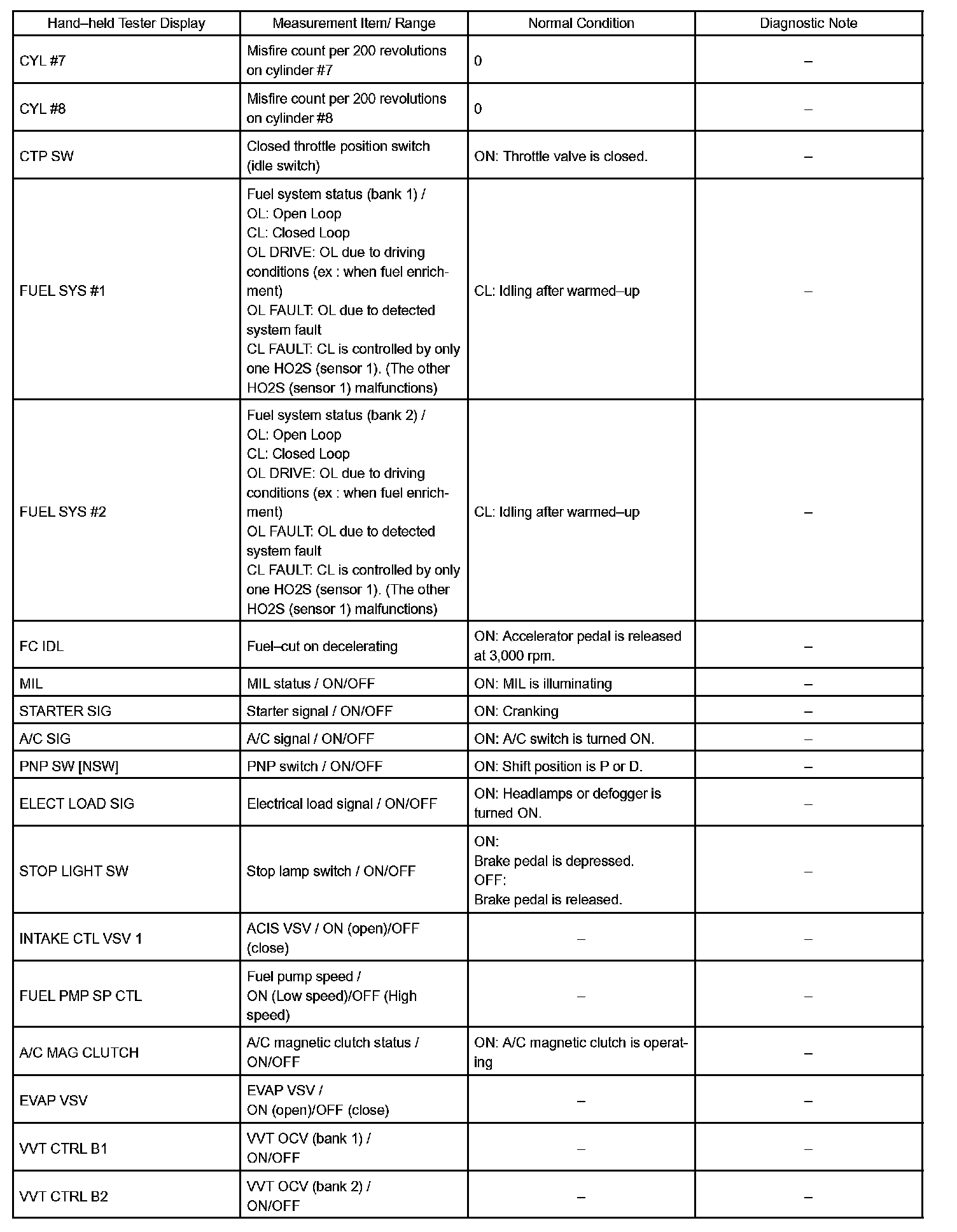 HINT: If no conditions are specifically stated for "idling", the shift lever is in the N or P position, the A/C and all accessory switches are OFF.