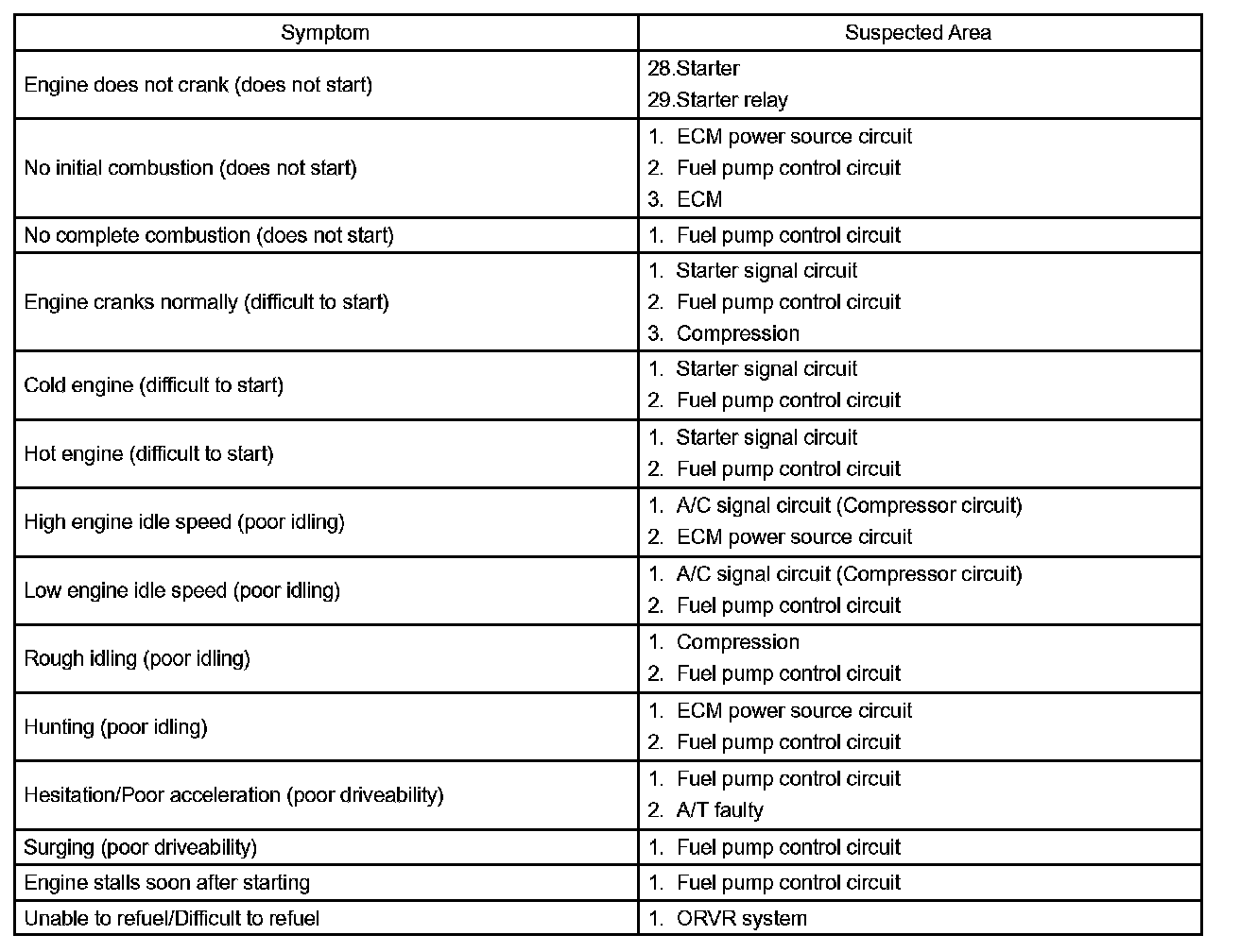 Problem Symptoms Table: