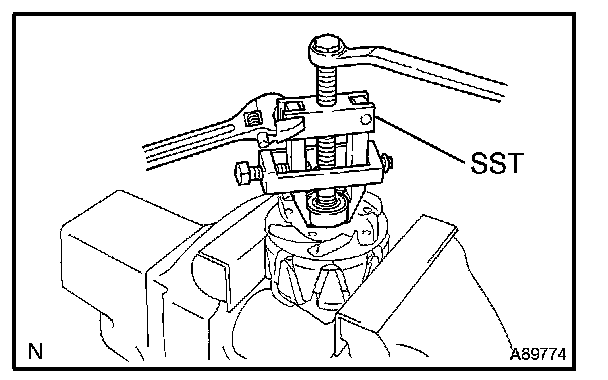 e. To loosen the pulley nut, turn SST (A) in the direction shown in the illustration.