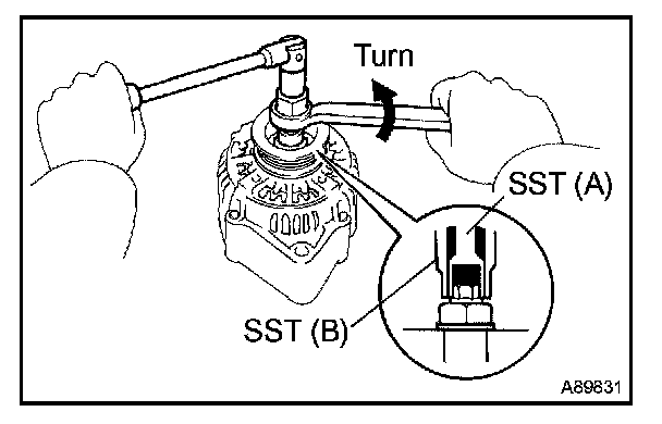 b. Hold SST (A) with a torque wrench, and tighten SST (B)clockwise to the specified torque.
