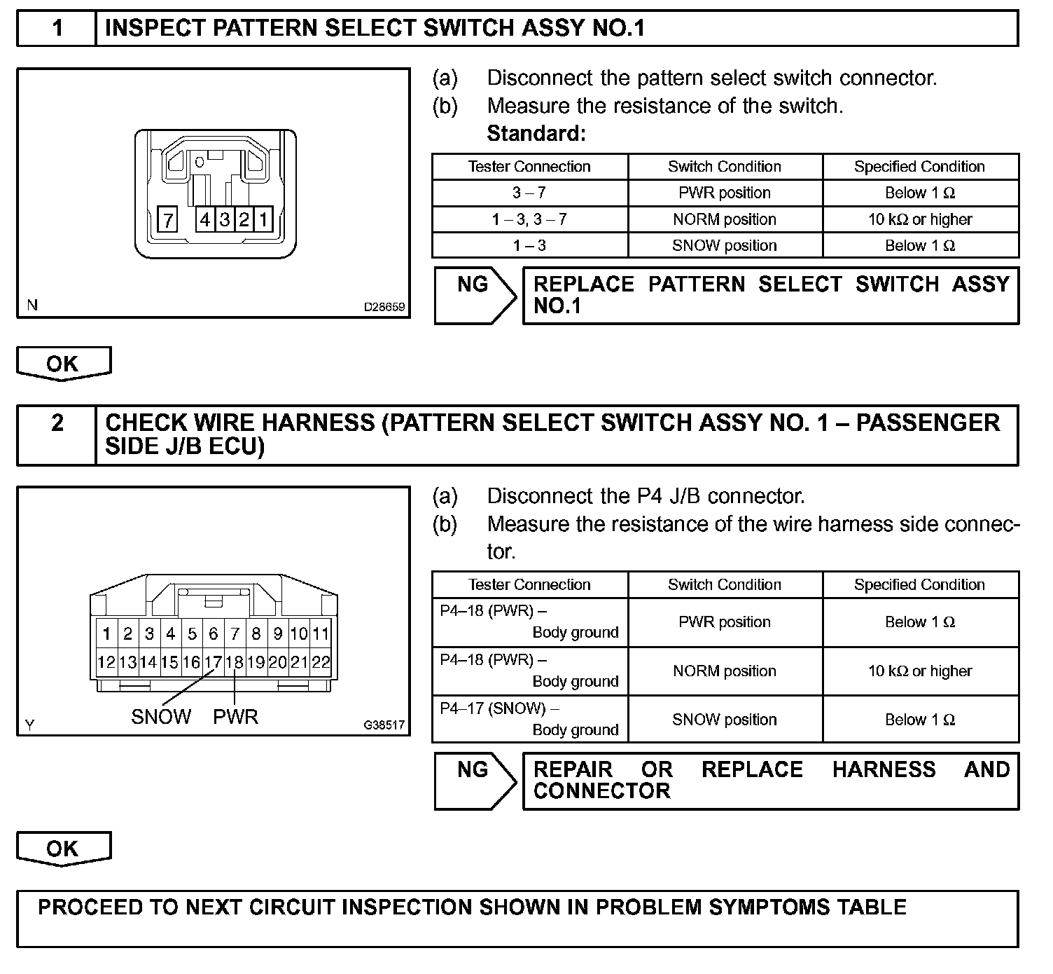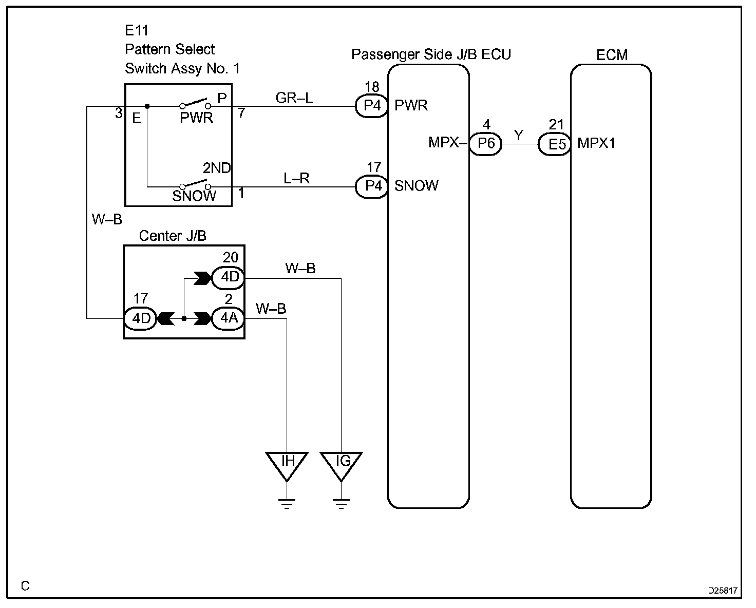 The ECM memory contains the shift programs for the following patterns: NORM, PWR, SNOW, 2nd position, L position and lock-up. The ECM follows the programs depending on signals from the pattern select switch, neutral start and various other sensors. By following the programs, the ECM turns solenoid valves ON and OFF, controls transmission gear changes, and activates lock-up clutch operation.
