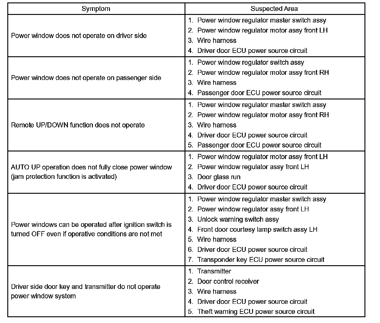 HINT: Use the table to help determine the cause of the problem symptom. The potential causes of the symptoms are listed in order of probability in the "Suspected Area" column of the table. Check each symptom by checking the suspected areas in the order they are listed. Replace parts as necessary.