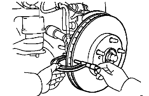 c. If the disc runout is greater than the maximum value, check the bearing play in the axial direction and check the axle hub runout. If the bearing play and axle hub runout are normal, adjust the disc runout or grind it on a "On-car" brake lathe.